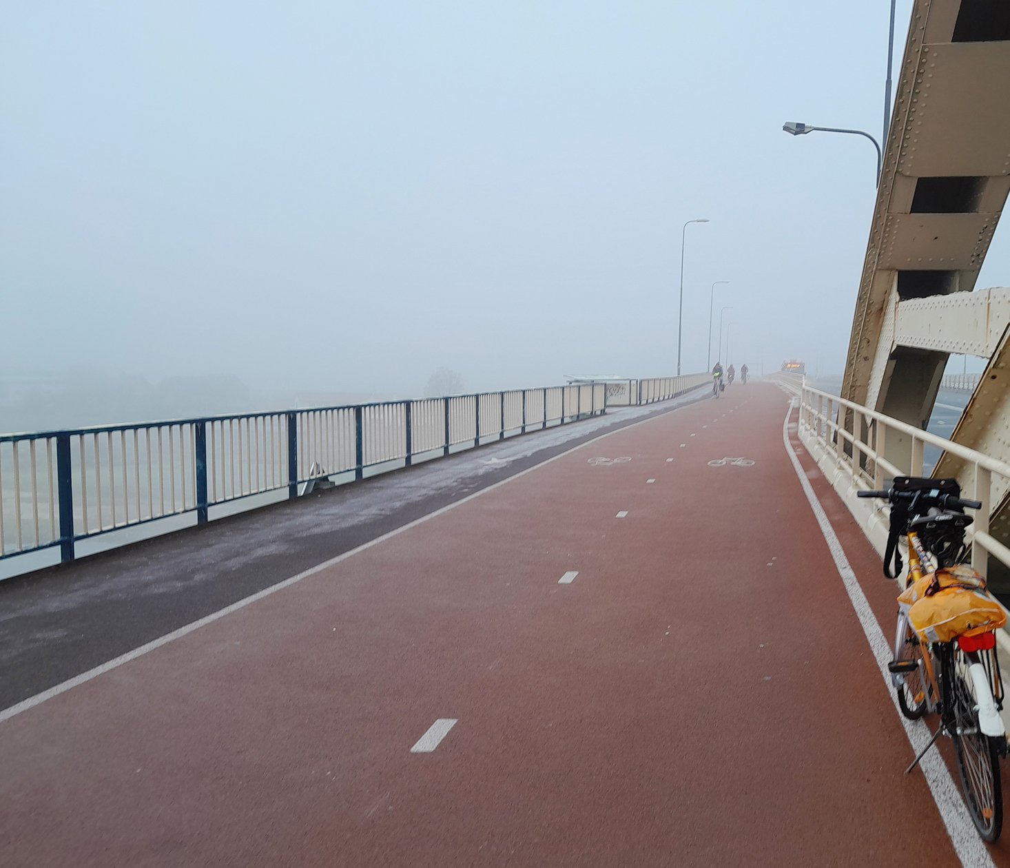 De vorige keer dat ik ooit op deze Waalbrug heb gefietst was in 1969, de brug had een donkergroene kleur (veel mooier) en het dorp Lent lag nog mooi in het groene landschap. Die kerktoren. Het fietspad toen nog smal. Ik herken de overkant nu haast niet meer. De "bypass" van de Waal, overal nieuwbouw en meer drukke wegen. Zucht....