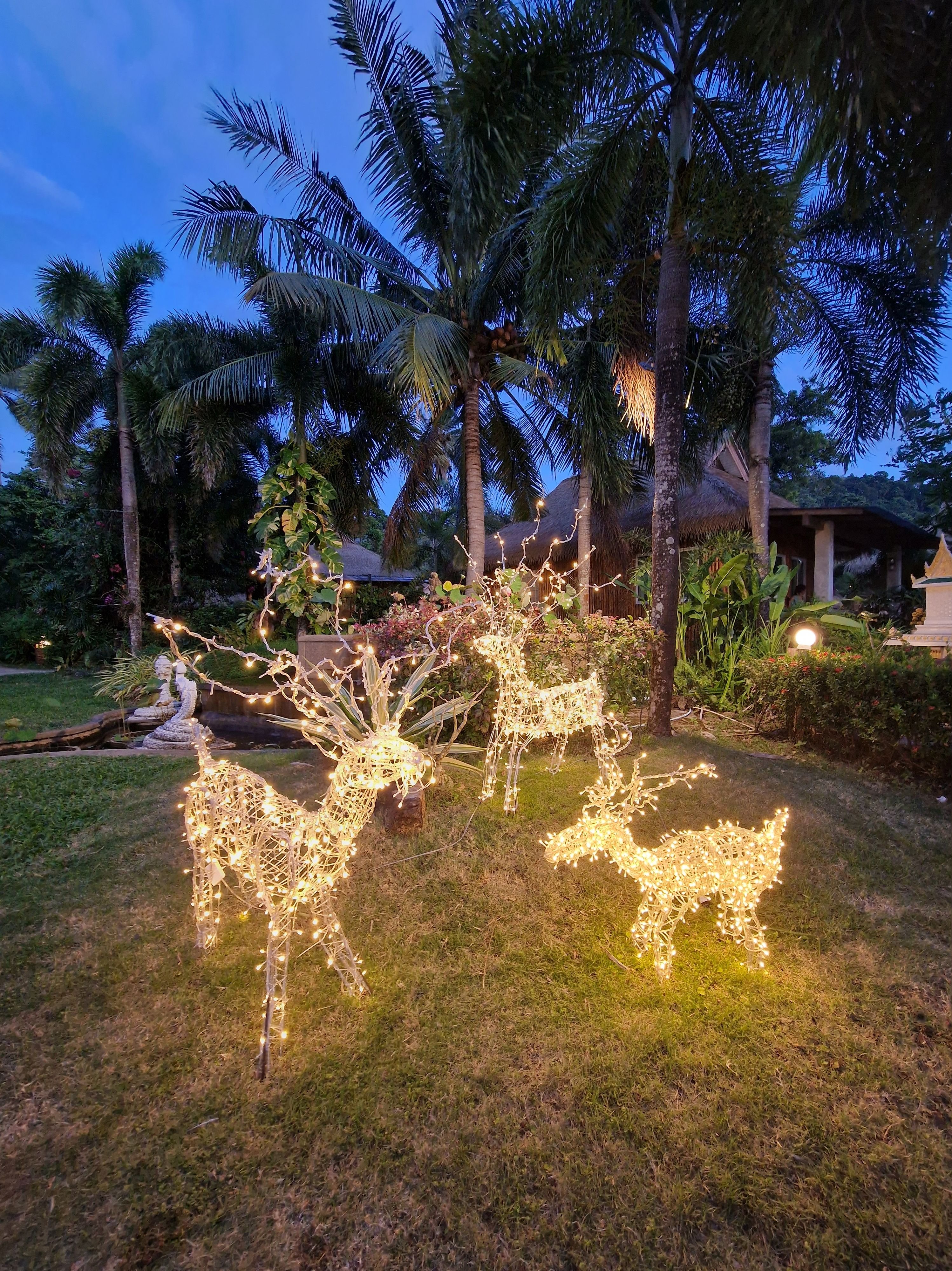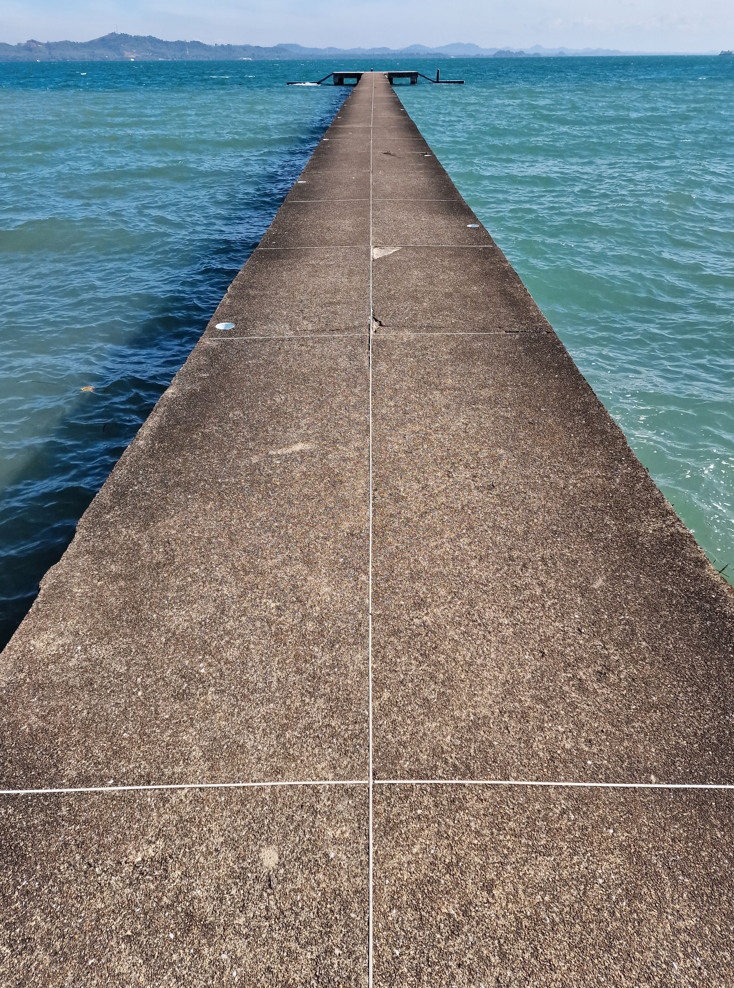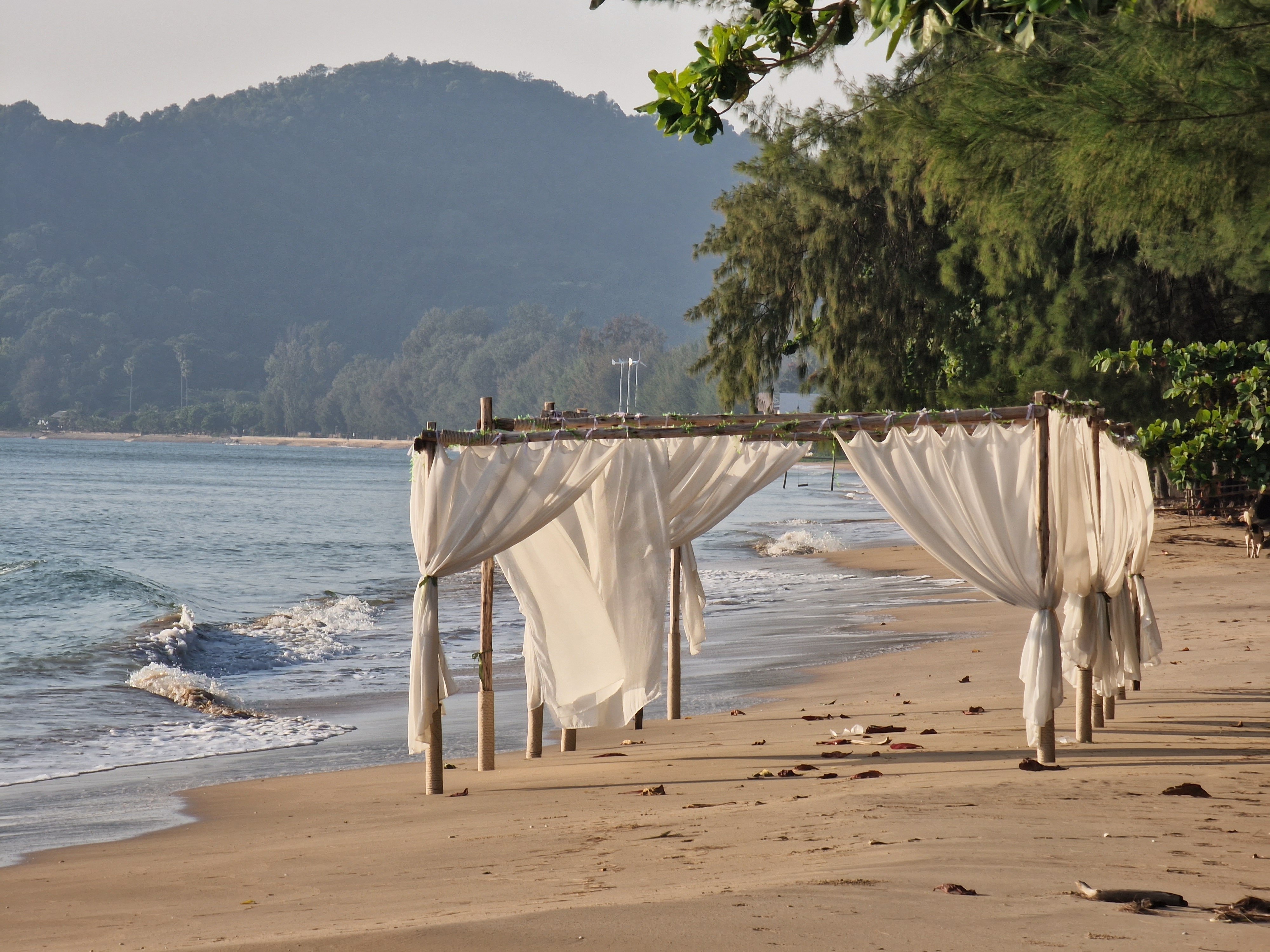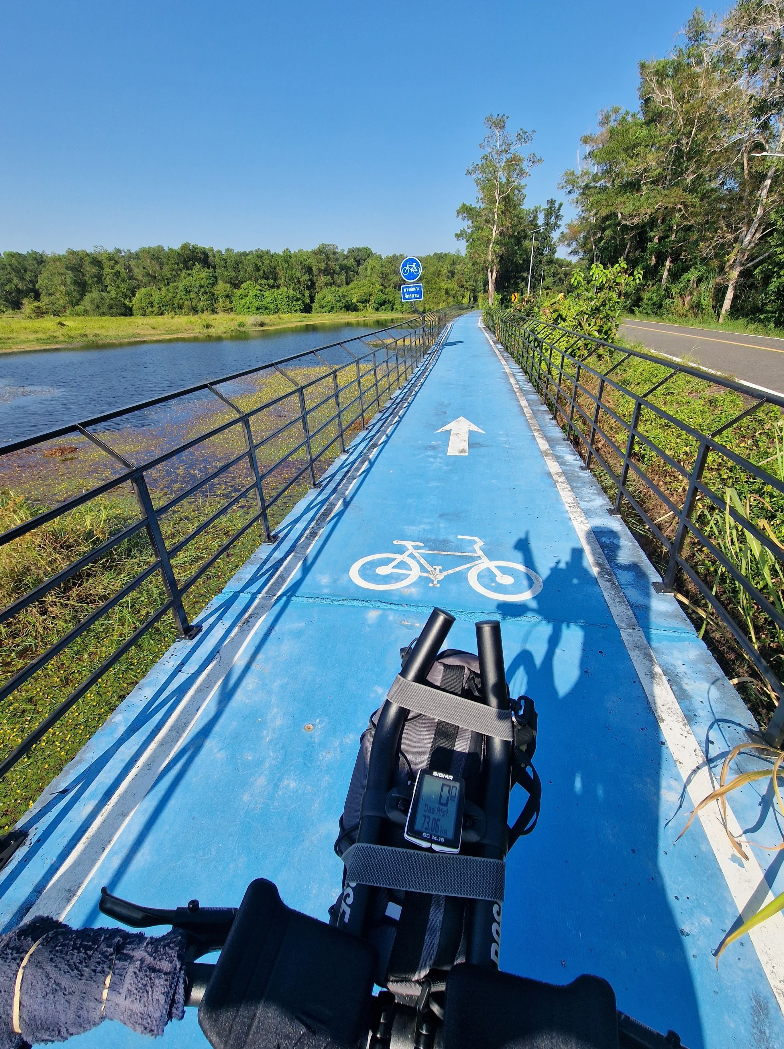 De tuin bestaat uit een aantal moeraseilanden die verbonden zijn met houten brugjes. Het landschap is niet uitzonderlijk spectaculair, maar het is heel aangenaam vertoeven in dit stukje natuur. Het is een mooi rustpunt tussen het Thaise verkeer van de vorige dagen. De brugjes zijn ook een dingetje: nog geen meter breed, geen borstwering en enkele 10-tallen meters lang. Op zich geen punt om er met beladen fiets over te rijden, maar ik behoed me opzij te kijken want ik wil het ondiepe water niet inrijden. Op het tweede brugje neemt een fotograaf huwelijksfoto’s van een mooi uitgedost jong stel. Met wat onhandig gesukkel en een verontschuldigend lachje wring ik me voorbij het koppeltje. Het laatste eiland laat ik voor wat het is want het pad ernaartoe staat onder water en ik kan niet inschatten hoe diep het precies is en hoe dik de onderliggende slijklaag is. Safety first – en het is ook nog wat vroeg om mijn 5-dagen oude fiets erdoor heen te jagen.