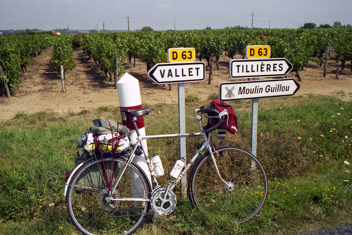De oranje Batavus, die in 1983 na een framebreuk een nieuw zeegroene frame kreeg (garantie van de fabriek) was ook weer versleten en in mei 2002 kocht ik op een braderie in Eenrum een tweedehandse zilverkleurige Batavus Champion. Hier ergens in de Franse Loirestreek, eind augustus 2002.