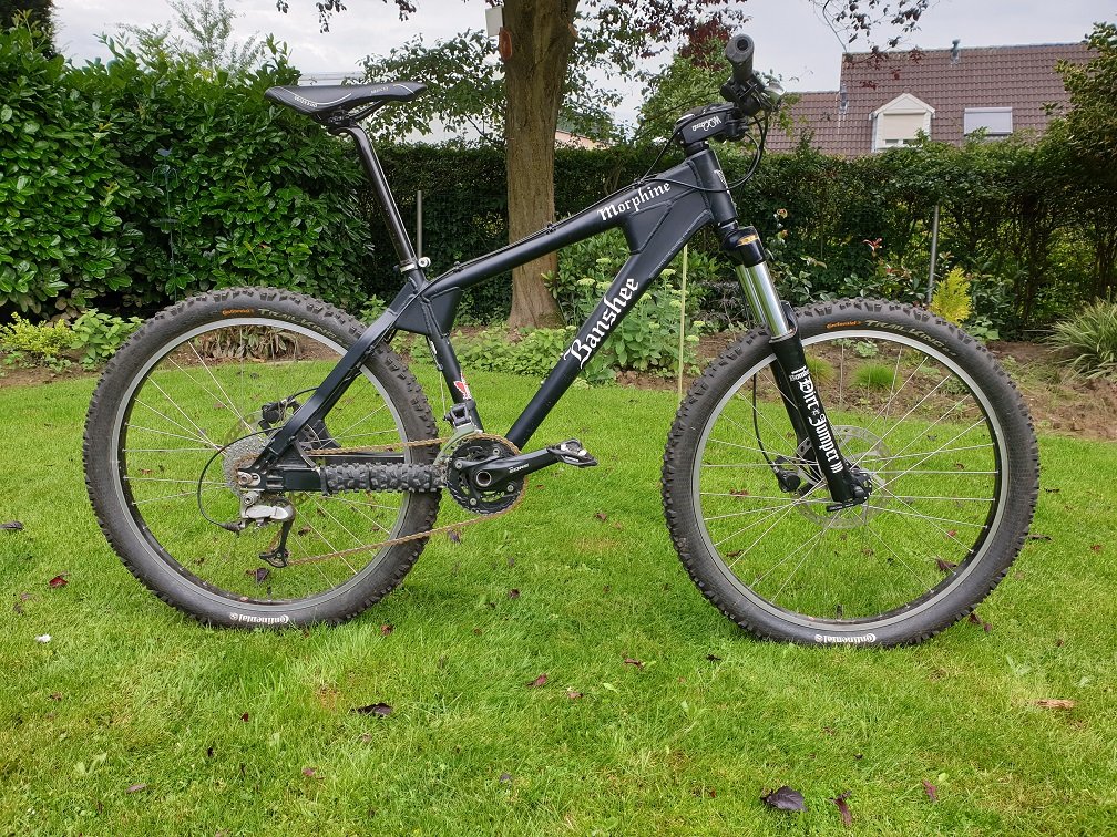 Voor de ritten waar mijn gravel/vakantiefiets het zwaar zou krijgen: een Banshee Morpine uit 2004. Beslist geen lichtgewicht, daarom wel een echte doordouwer.