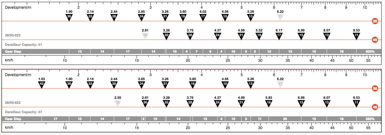 Om dit soort verschil gaat het bij GRX. Van een lichtste verzet van 1,9 meter per pedaalomwenteling (met 50-622 banden) naar het 17% lichtere verzet van 1,63 meter. Volgens mij nog steeds een stukje zwaarder dan de huidige MTB oplossingen of waarmee sommige Rohloff/Pinion vakantiefietsers mee rond rijden.