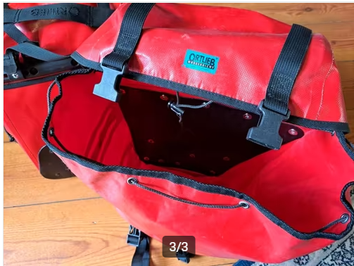 een setje echt heel oude, maar nog zo te zien nog in goede staat verkerende, rode Ortlieb-tassen.