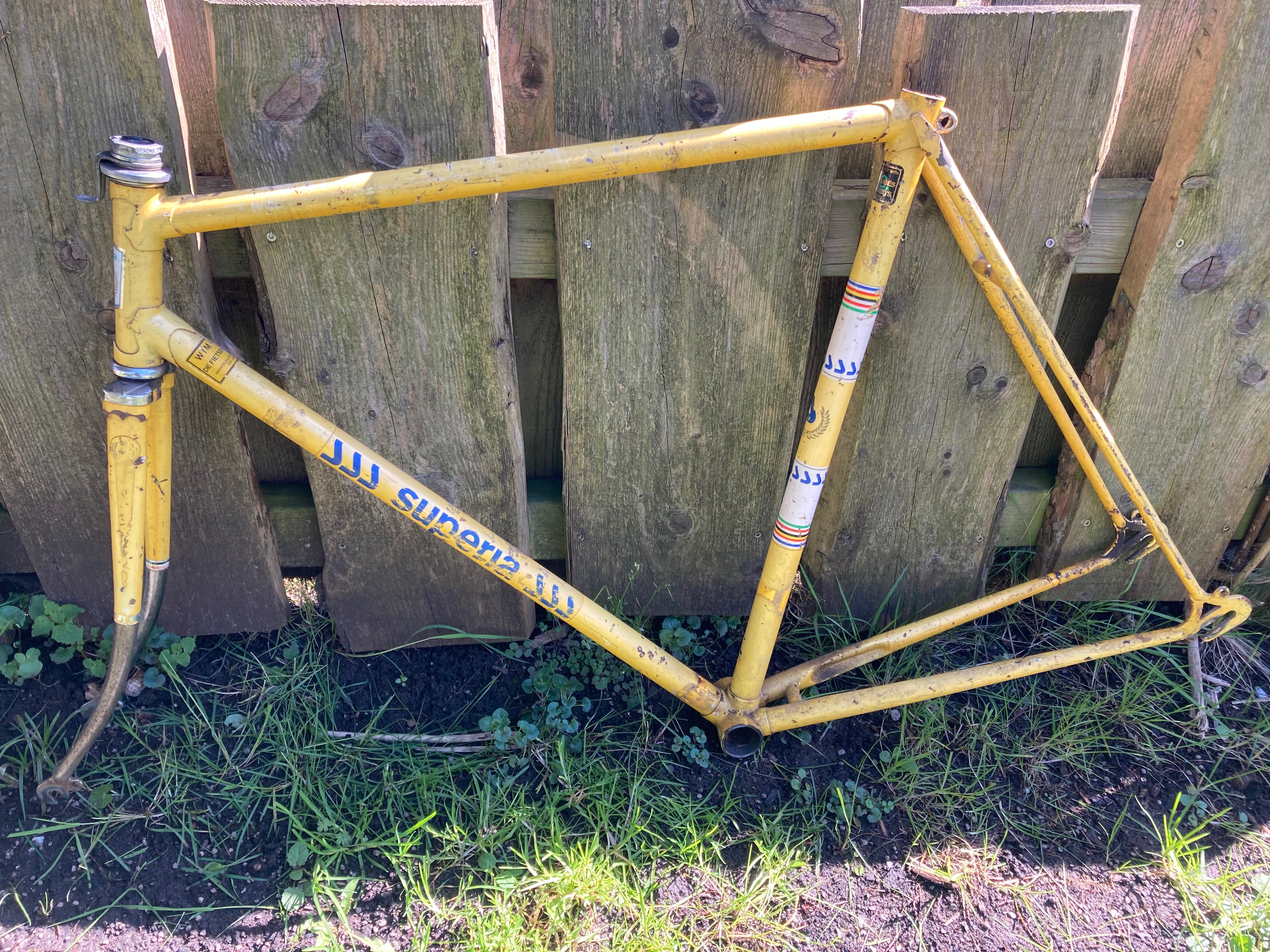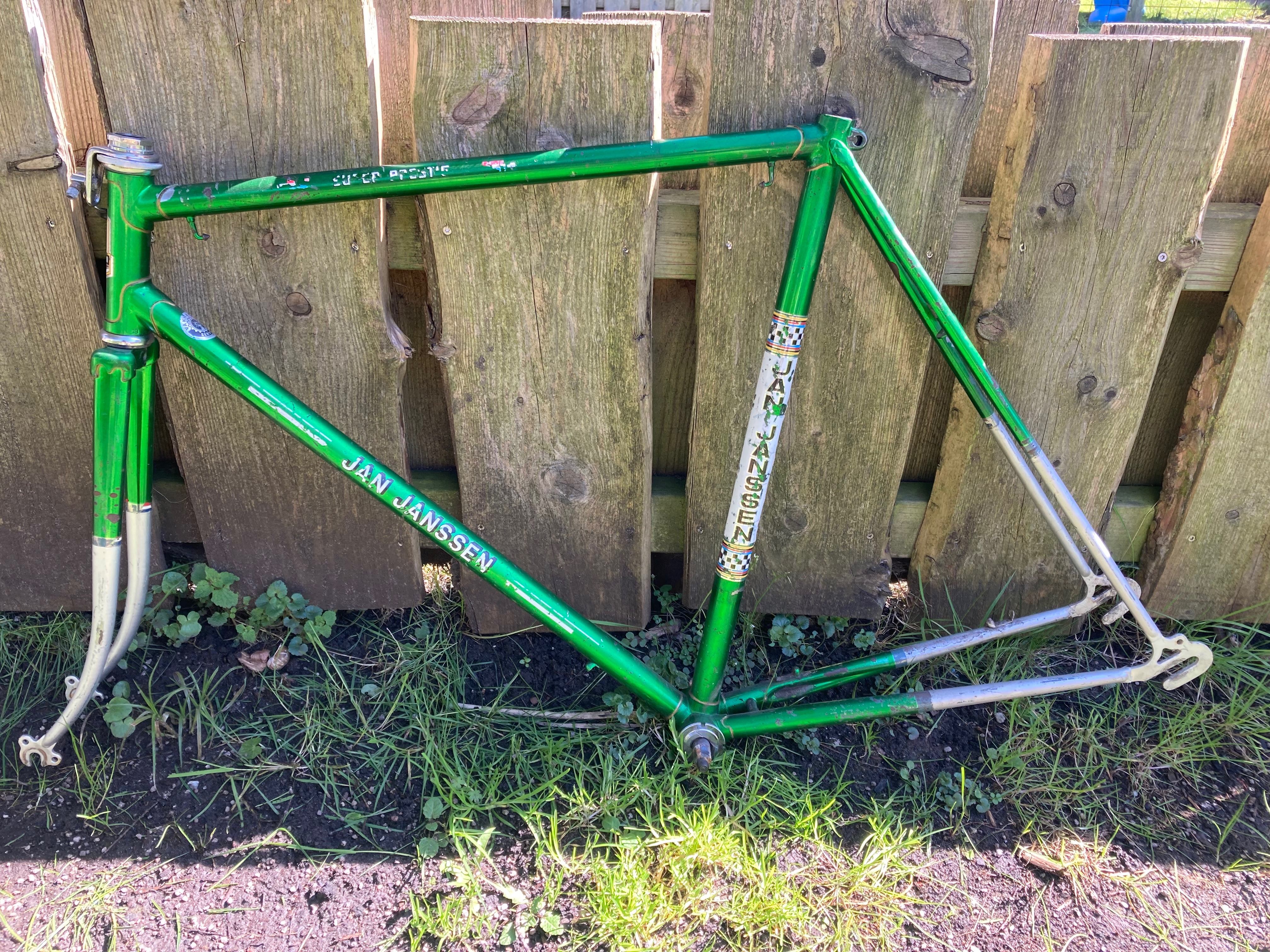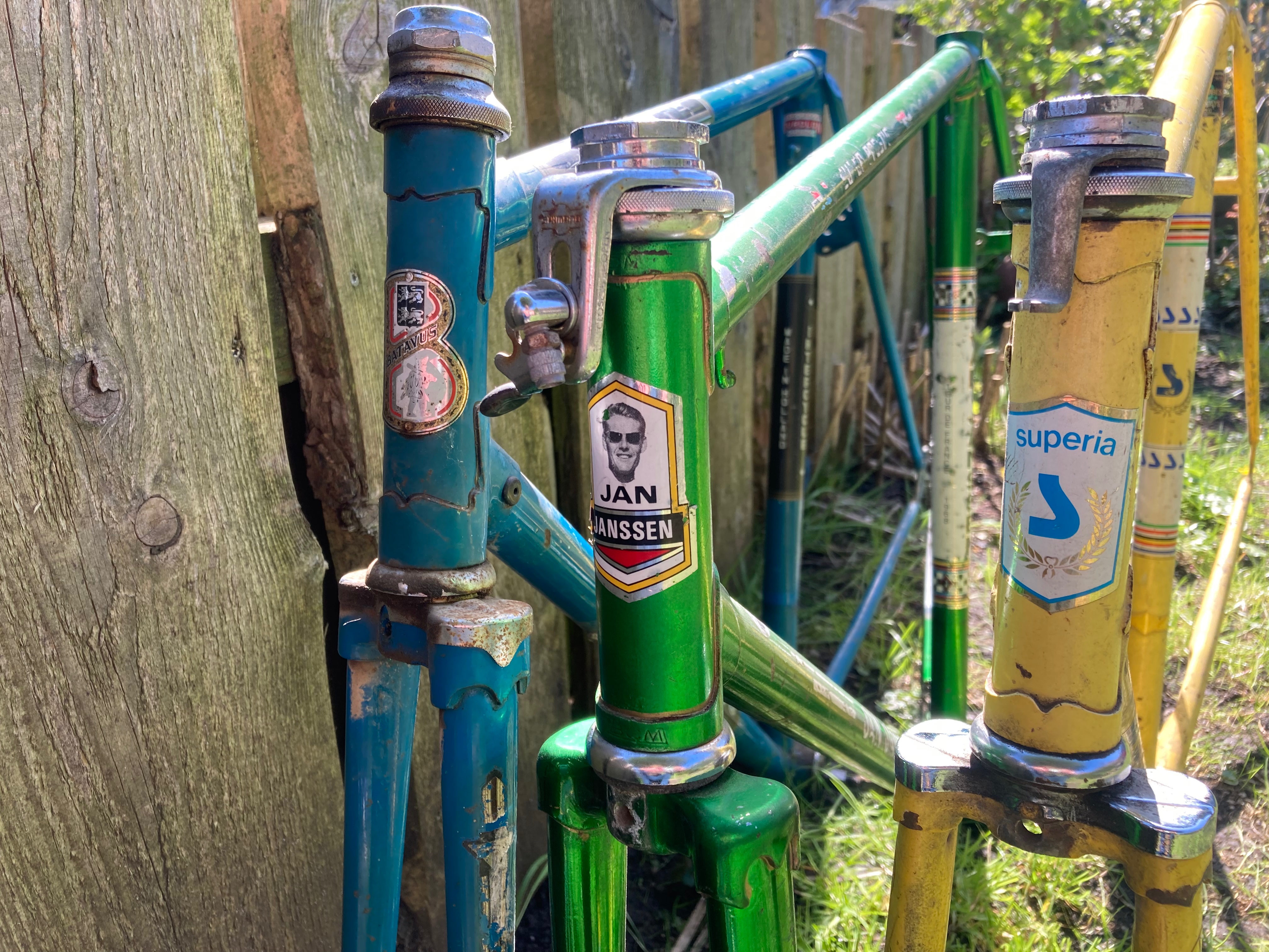 Allemaal maat 57/58. De staat van de frames hangt een beetje tussen oud ijzer, tof om op te bouwen, en decoratief in de mancave.