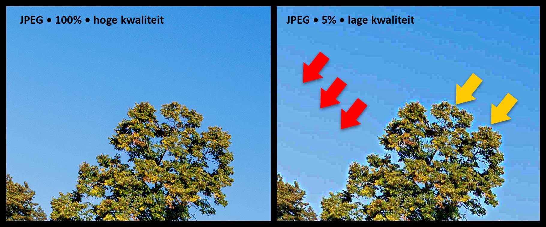 Zo ziet overmatige compressie er uit, let op de blokjes en de verschillende zones in de lucht