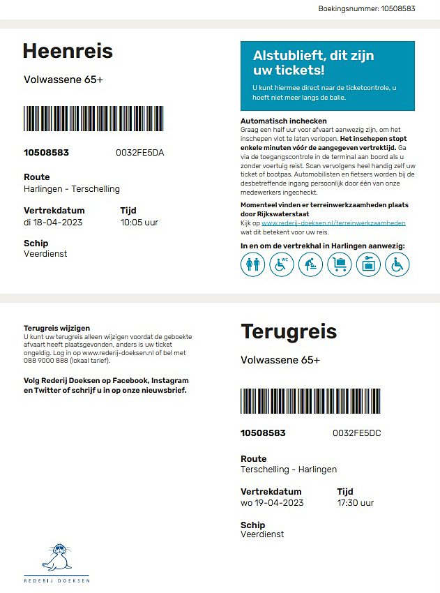 Voor Terschelling staat er een barcode zowel op de heen- als terug-kaarten. Een medewerker van Doeksen staat met zo'n scanner aan de kade voor het aan boord gaan. De naam van de passagier staat er niet op. Dan zijn er nog aparte kaarten voor de fiets. Dus voor twee personen vier A4-tjes uitprinten.