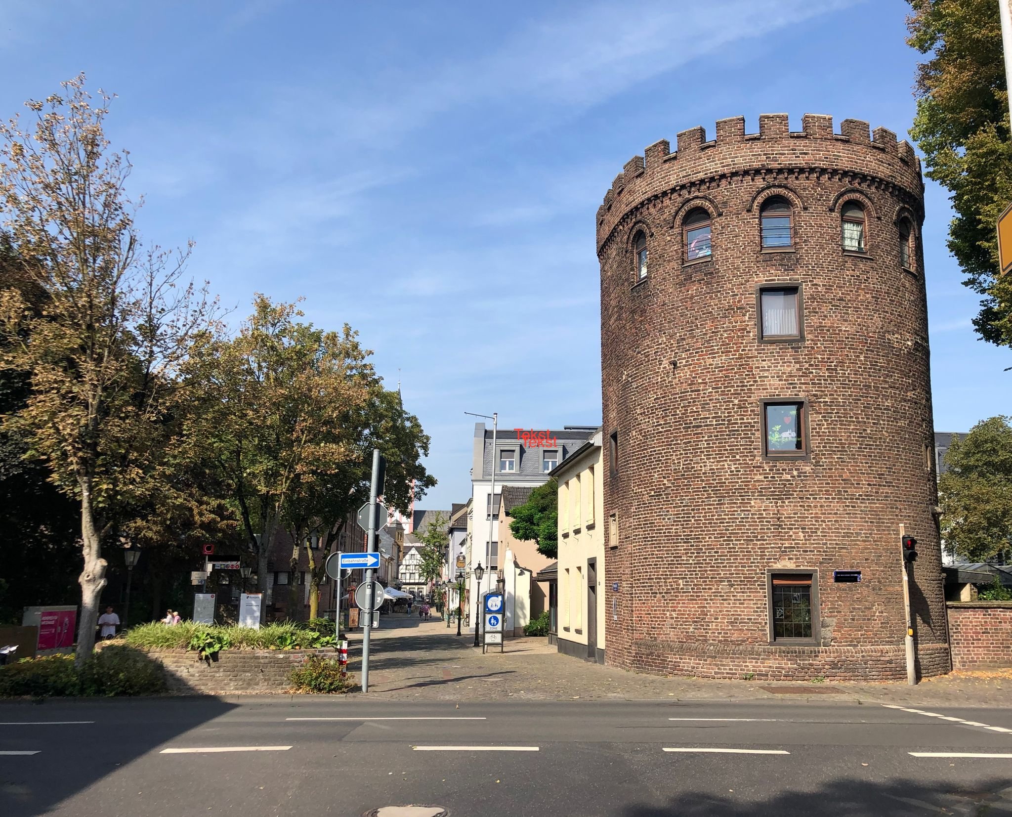 Onomstotelijk Duitsland. Het was op Google Afbeeldingen een heel gezoek naar "Wehrturm einer Stadtmauer in...." (naam deelstaat). Maar als ik de foto eens goed bekijk, is het geen vestingtoren. Links ligt nog een restant. Was het een Stadttor? Dan gevonden als: Peterturm, Rest vom ehemaligen Petertor in Kempen, Nordrhein-Westfalen. Jammer van die lelijke ramen, on-monumentaal.