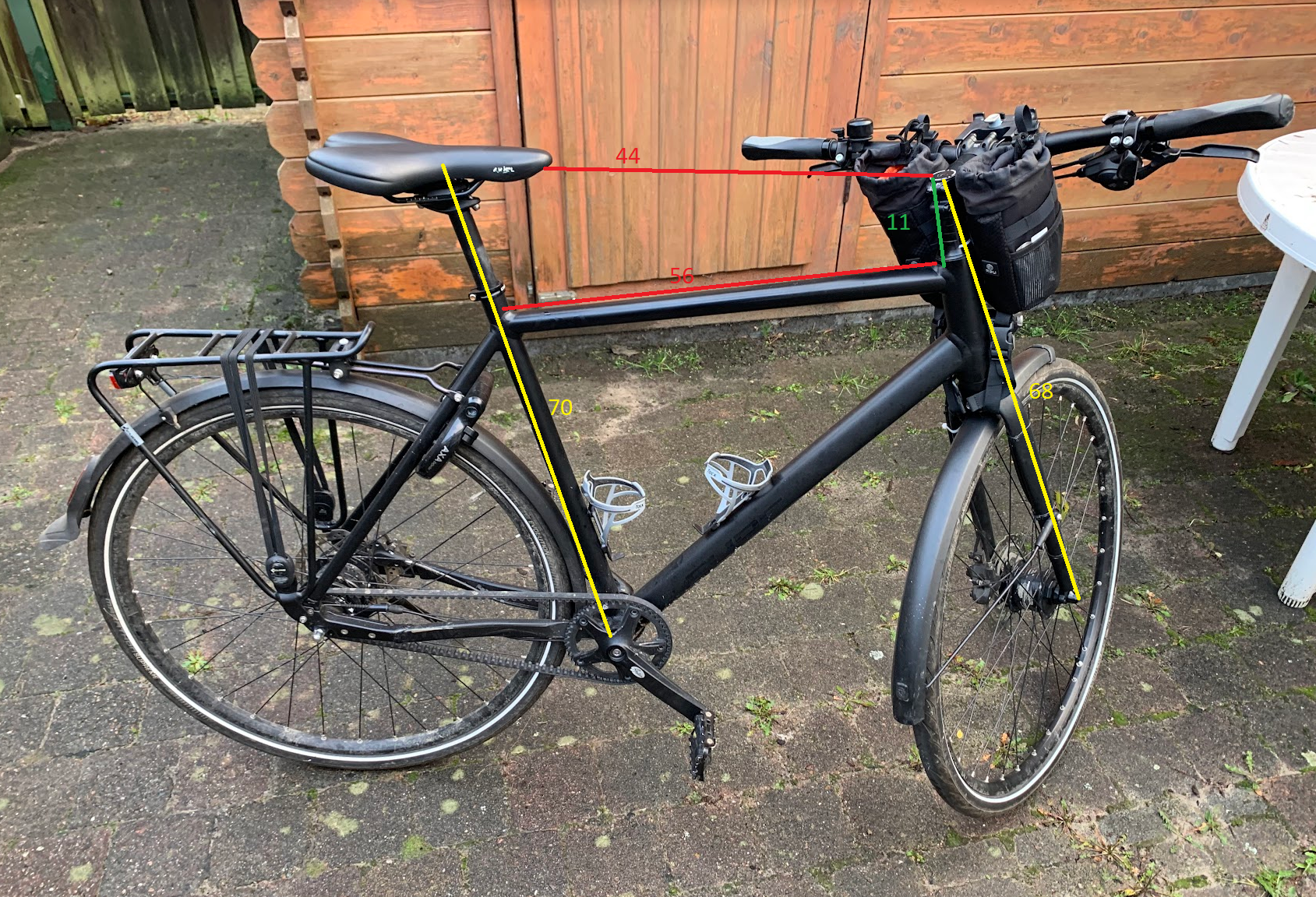 Die Santos 3+ (oranje fiets van foto's hierboven) heb ik ook een moment opgezeten (niet gefietst) en die voelde gelijk goed aan, ook deze maten maar even toegevoegd aan de tabel: