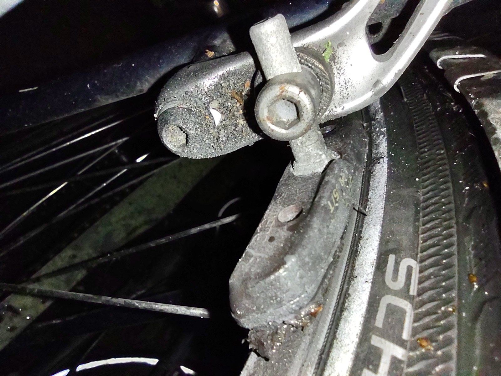 Leon schreef: Mijn hemel, op de derde foto hangen de aluminiumkrullen uit de velg om het blokje. Dat komt waarschijnlijk omdat er een steentje of andere rotzooi in de blokjes zit. Shimanoblokjes zijn daar berucht om; die zijn te zacht. Maak de fiets eens een keer schoon, dan kun je ook zien dat een paar van je blokjes dramatisch schuin aan het afslijten zijn.