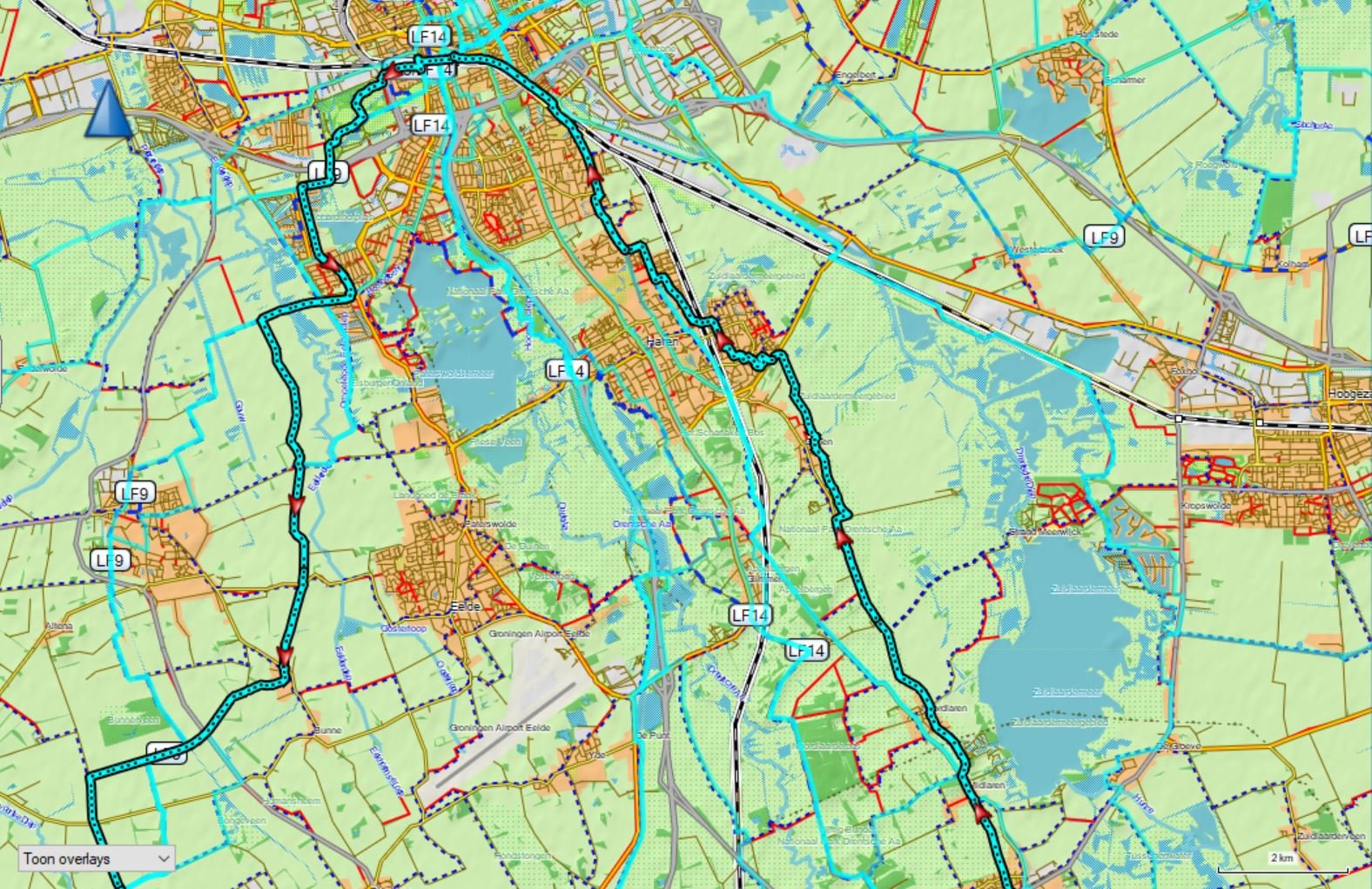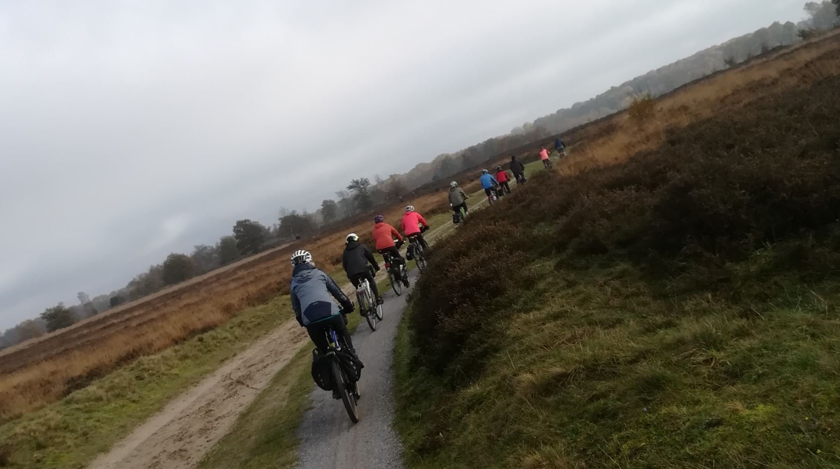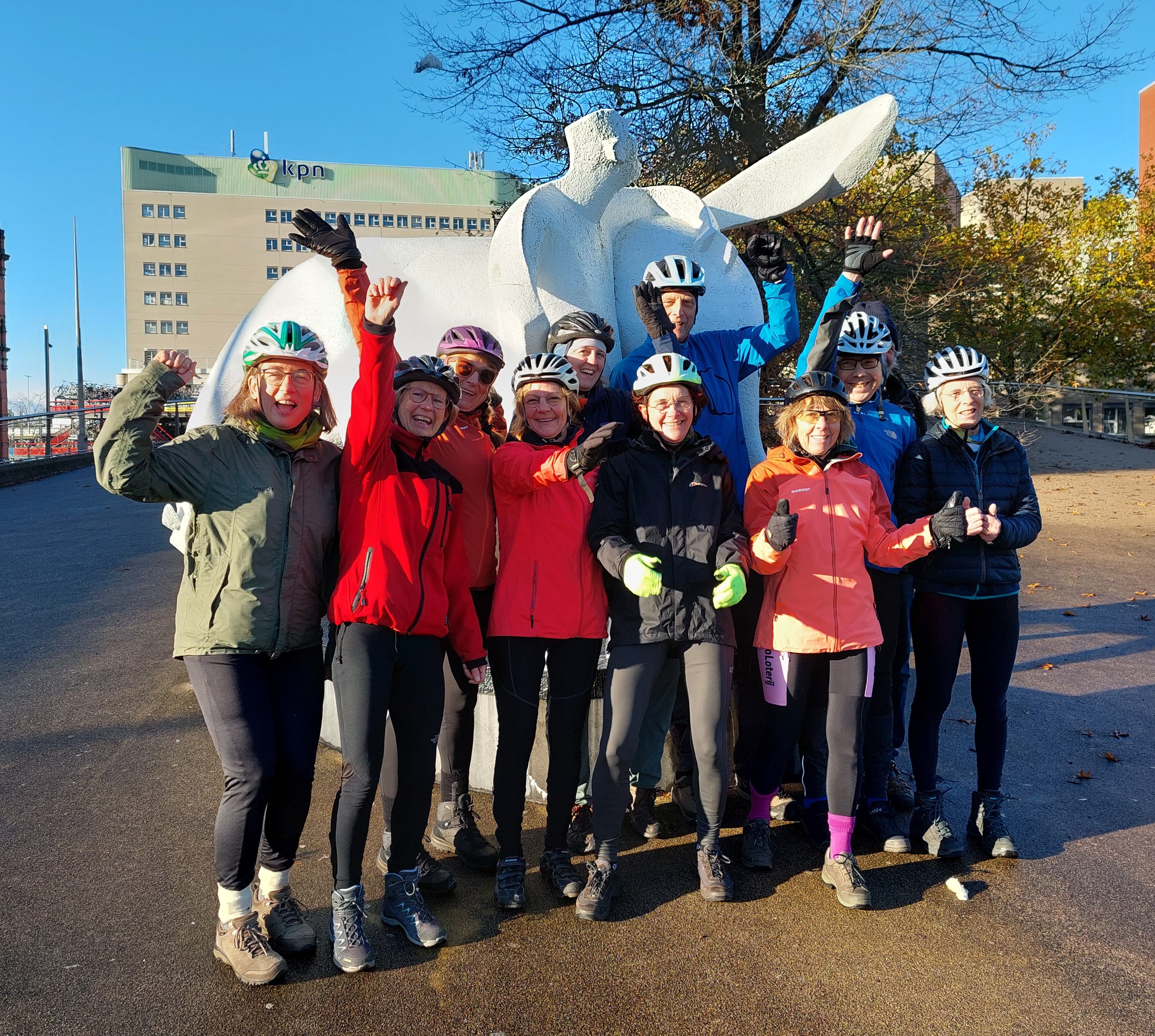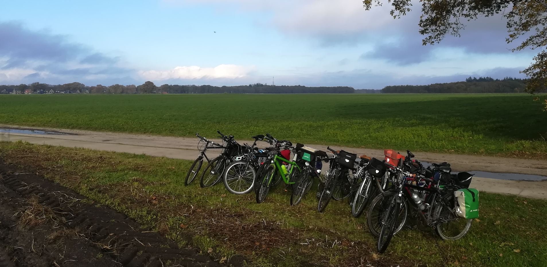 Wat hadden we vandaag een geluk met het weer. Koud maar zonnig, prachtige vergezichten, schitterende herfstkleuren. En opnieuw een leuk en gezellig rondje. Met zijn elven (René en Geke, Kees, JanH, Marloes, Rikie, Annelies, Cilia, Edith, Marianne en Petra) vertrokken we even na tienen vanaf het Peerd, waar we vlak voor vertrek nog even een groepsfoto maakten. Daarna door de Onlanden, in de buurt van Norg over de heide en eerst op weg naar café Hingstman in Zeijen voor een lekkere kop koffie/thee met gebak. Lekker kletsen, bijpraten, lachen. Daarna een doorsteek naar Taarlo, over het schitterende Balloërveld en via de bossen naar Annen. Tussendoor nog een boterhammenstop op een es, waar Jan onze fietsen vereeuwigde. Achterlangs Zuidlaren, door Midlaren en Noordlaren en in Onnen via de gravelweg naar Haren alwaar we bij mij aan de snert konden. Die ging er met veel gesmul en gesmikkel weer goed in. Het laatste stuk terug naar Groningen, waar we tegen vier uur ons rondje om het Peerd fietsten. Dank aan René en Kees voor de gezamenlijke productie van de route. En natuurlijk hebben we de foto's nog.