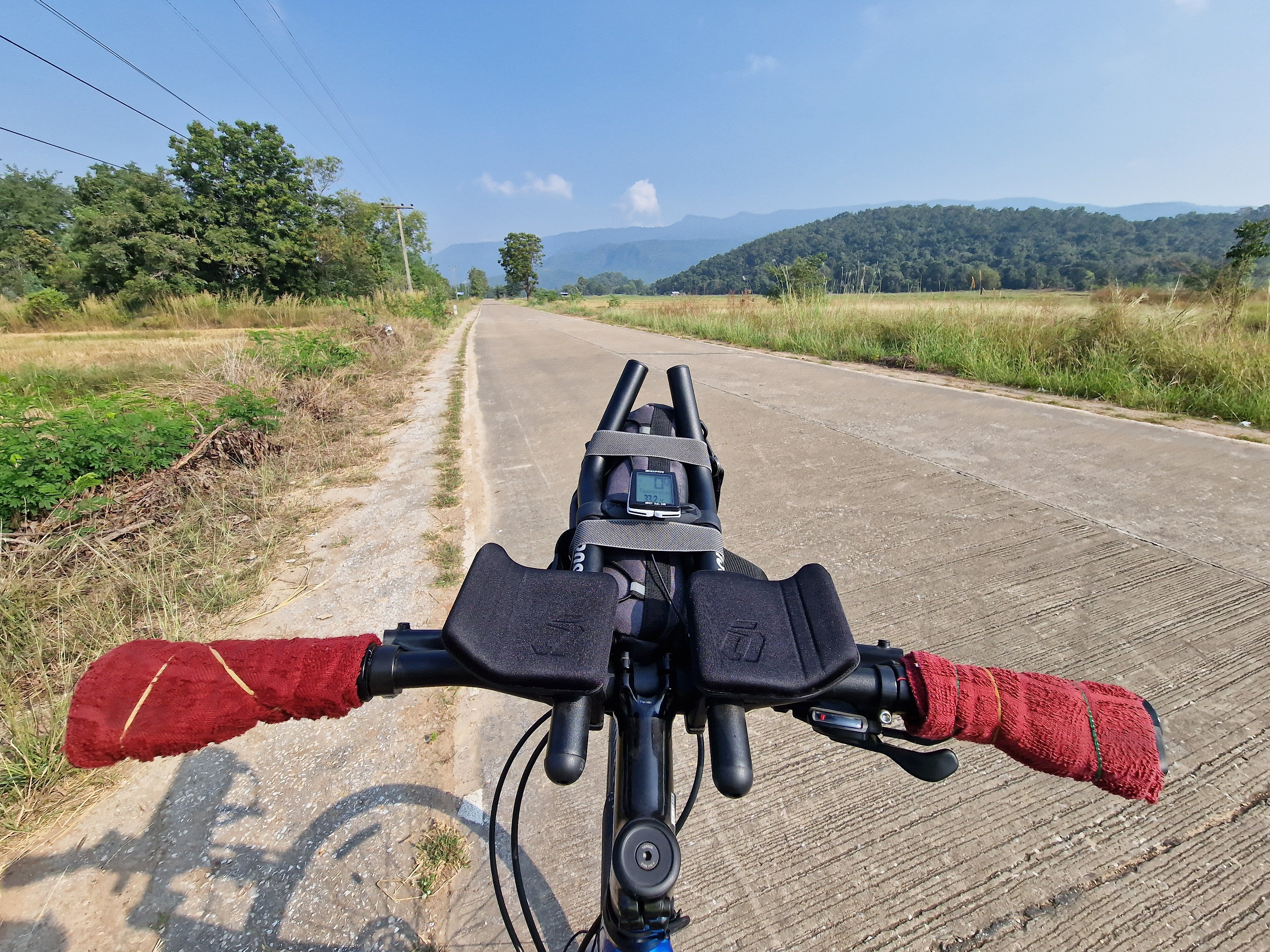 Via de strakke 3504 fiets ik zuidwaarts en laat de lange heuvelkam achter me liggen. Geen dog chases meer hier, de baan is breed genoeg, het weinige verkeer is te snel. Lekker op het ligstuurtje en draaien met de beentjes. Het landschap is vlak met rijstvelden en suikkerriet en beboste heuvels bij de horizon. Ik heb het eerder gezien, maar het verveelt niet – het is aangenaam fietsen. Zoals gewoonlijk is de kwaliteit van de weg top.