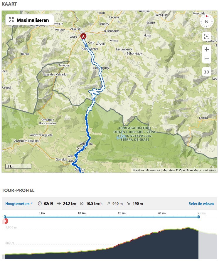 In Mei gaan wij vol bepakt van de Atlantische Oceaan naar de Middellandse Zee fietsen aan de Spaanse kant van de Pyreneeën. Hiervoor gaan we de Pyreneeën over bij Saint-Jean-Pied-de-Port en dat lijkt op 2 manieren te kunnen. Of op een iets grotere (drukkere) weg die wat geleidelijker omhoog gaat (screenshot 1 hieronder), of een rustigere weg maar met een relatief lang deel dat erg steil (>10%) is (screenshot 2). Heeft iemand ervaring met 1 van de 2 routes?