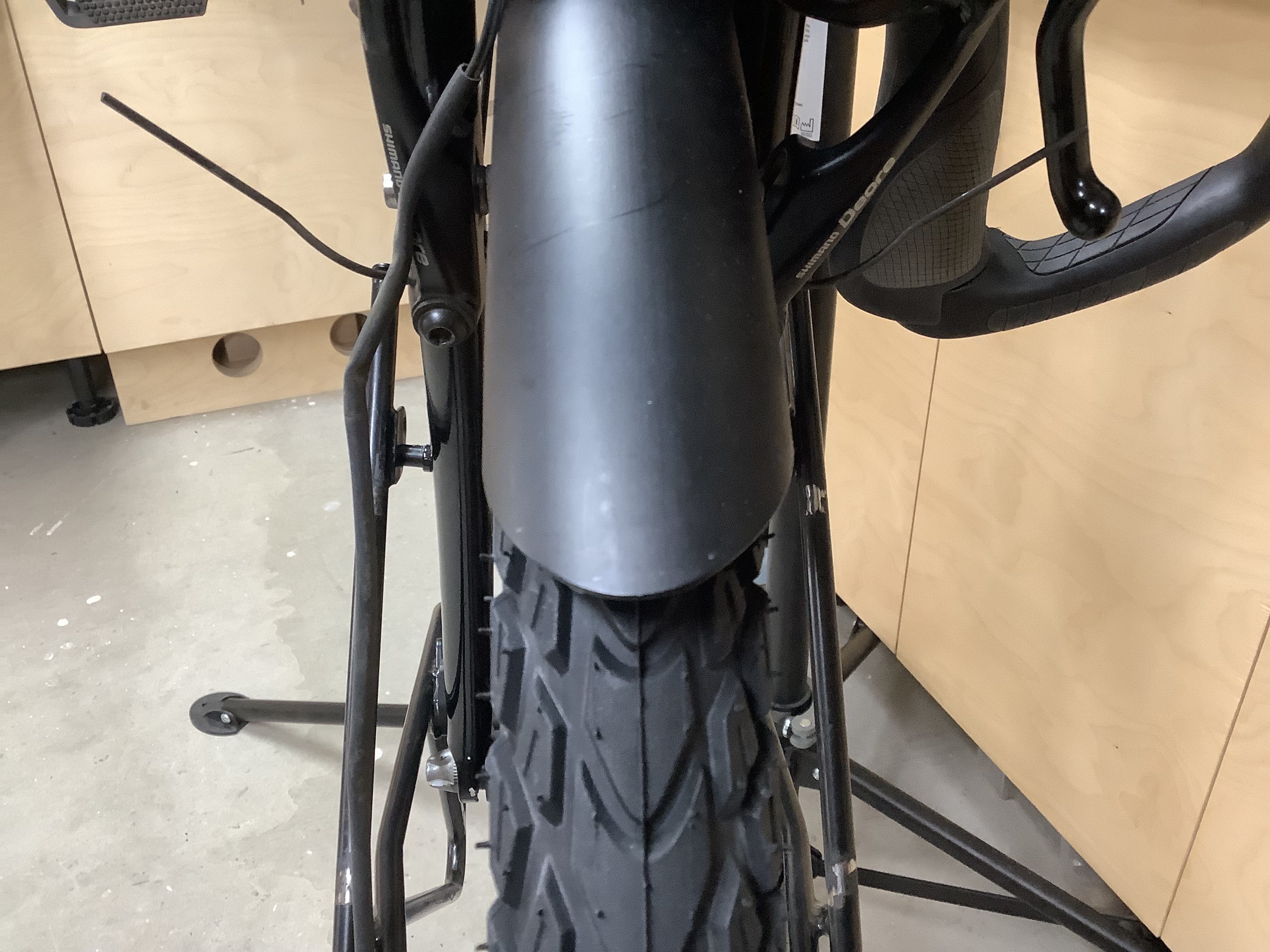 Gister het voorwiel met 50mm banden teruggeplaatst. Wel wat geklooi met het spatbord. Ik moest langere beugels kopen omdat de oude te kort zijn afgeknipt. Die waren een fractie dikker dus moest ik de oogklembouten wat uitboren om het passend te maken.