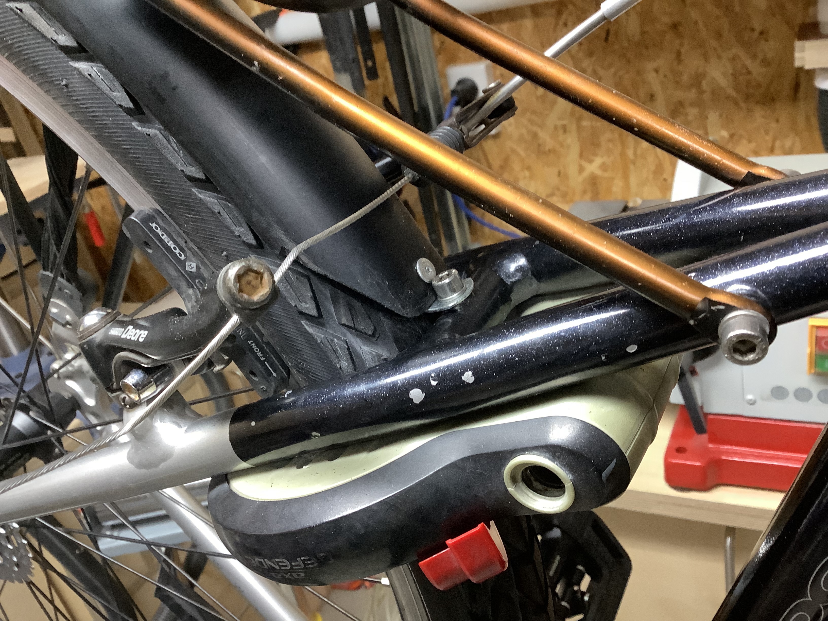 De oogklembouten moest ik uitboren. Dat zijn de boutjes die gebruikt worden om de stangetjes aan het spatbord te monteren (zie foto hierboven). Ik moest nieuwe stangetjes kopen, maar die zijn dikker dan degene die ik heb. Die moest ik vervangen door langere om de dikkere (vooral ook hogere) banden te kunnen monteren.