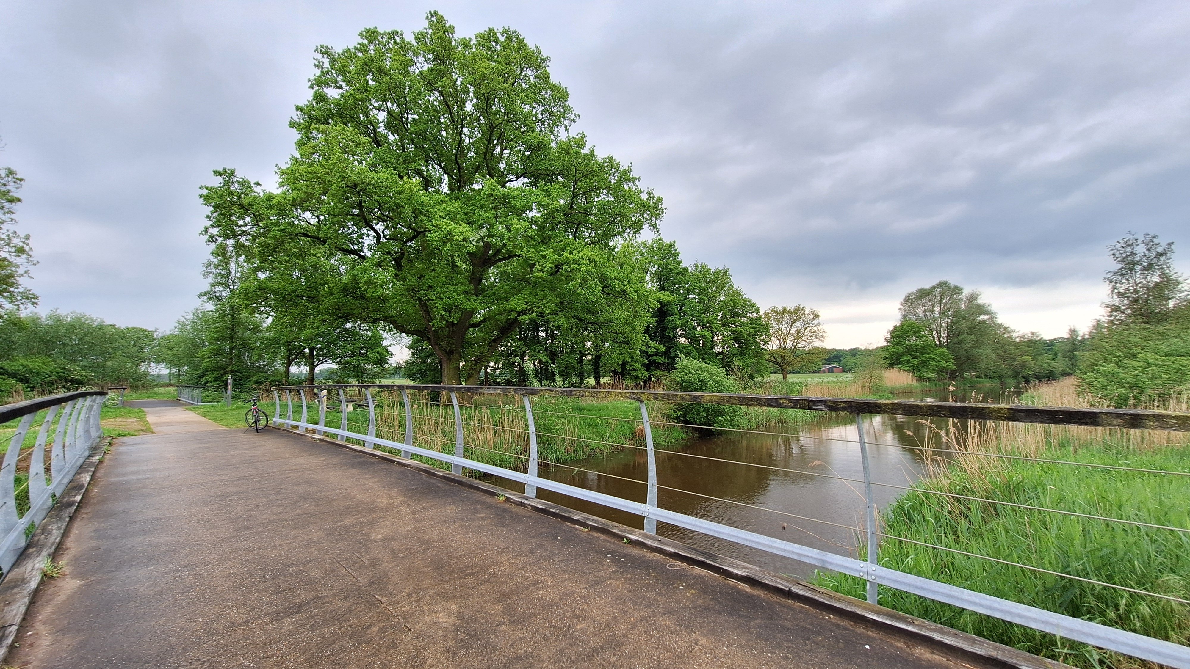 Hallo Poppink, niet helemaal makkelijk zat: het was wel een tijdje zoeken op Google Maps (niet satelliet, want op Maps zie je het blauw van het water makkelijker) om twee bruggetjes in een rechte lijn over zo'n splitsing te vinden. Had even gestopt, maar nee, verder gezocht. Best jaloers op jouw mooie fietsomgeving.