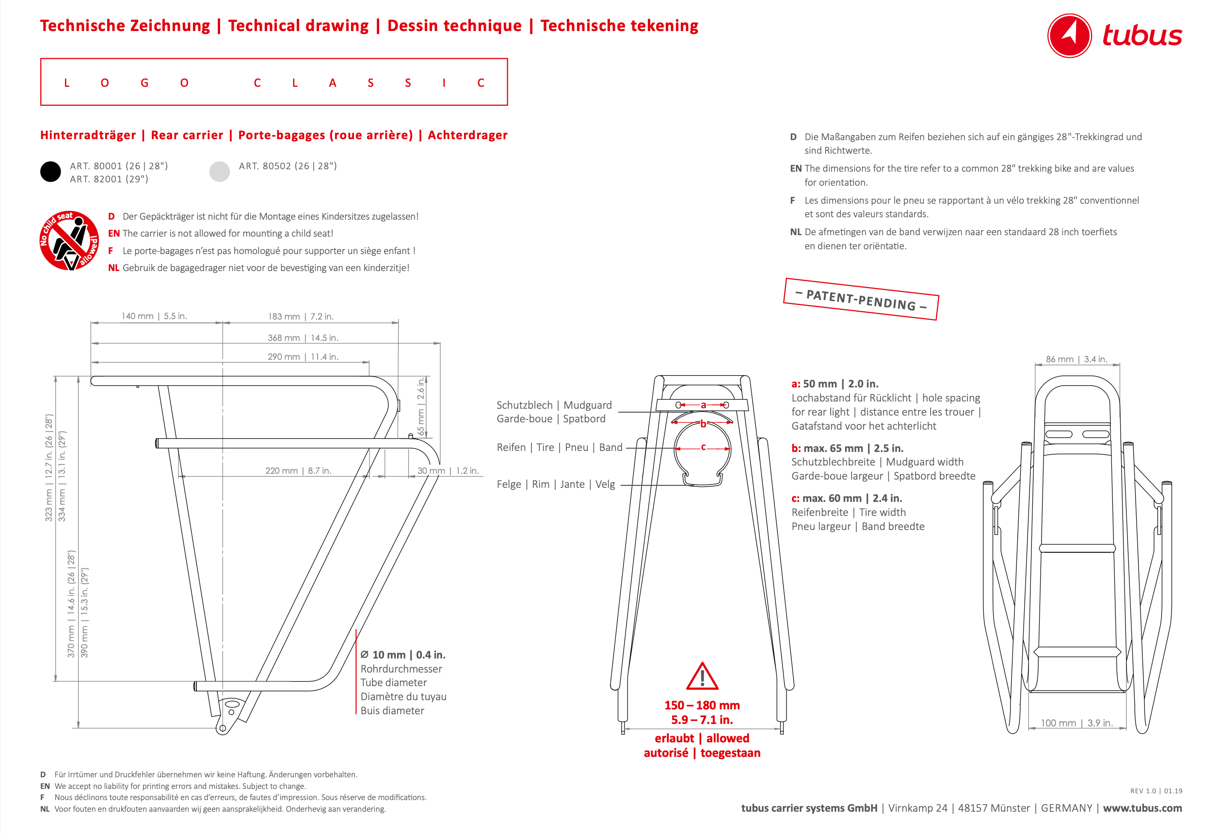 De Tubus Logo is ontworpen voor fietsen met 26-28 inch wielen. Voor details van de afmetingen, zie afbeeldingen.