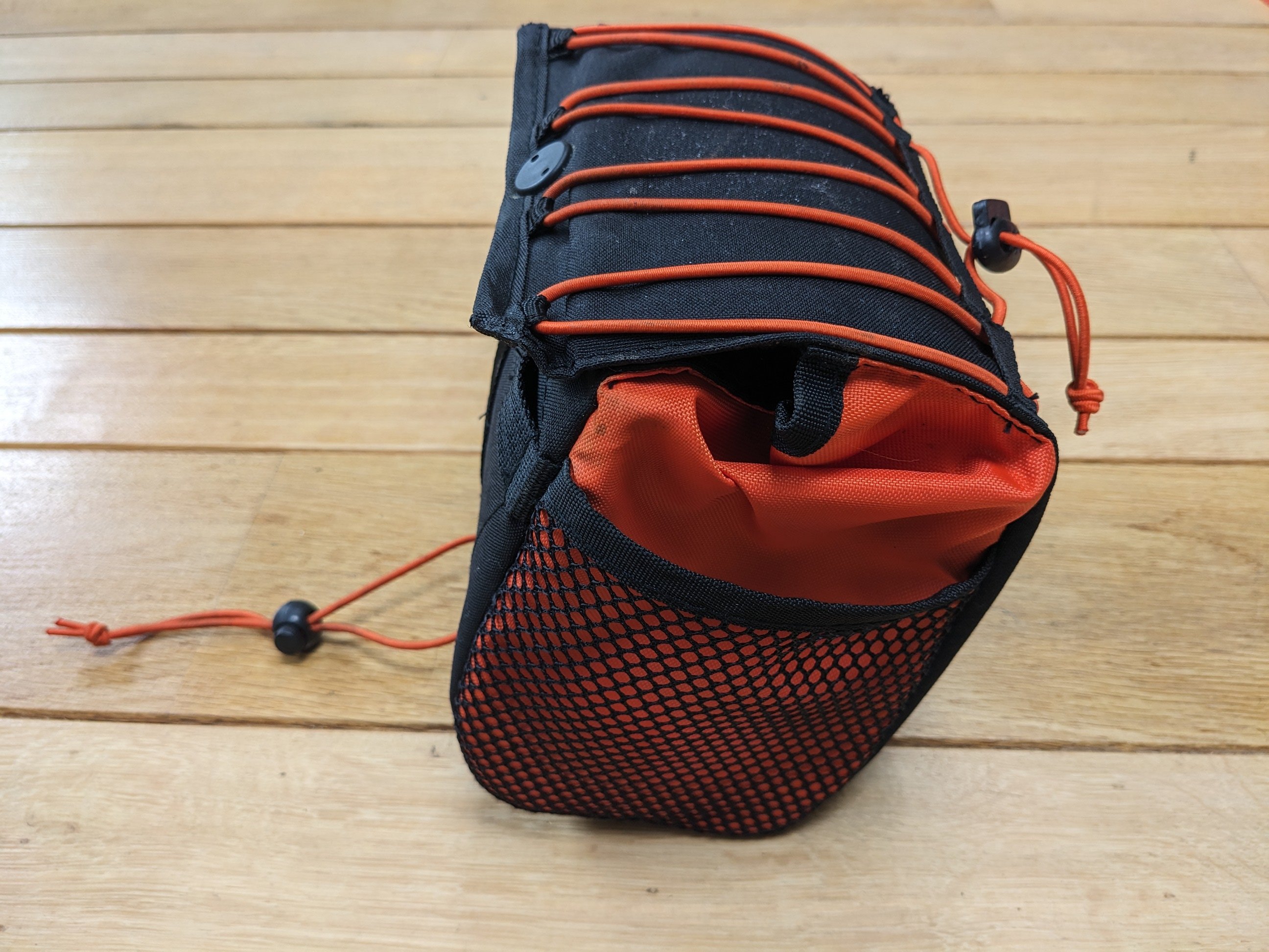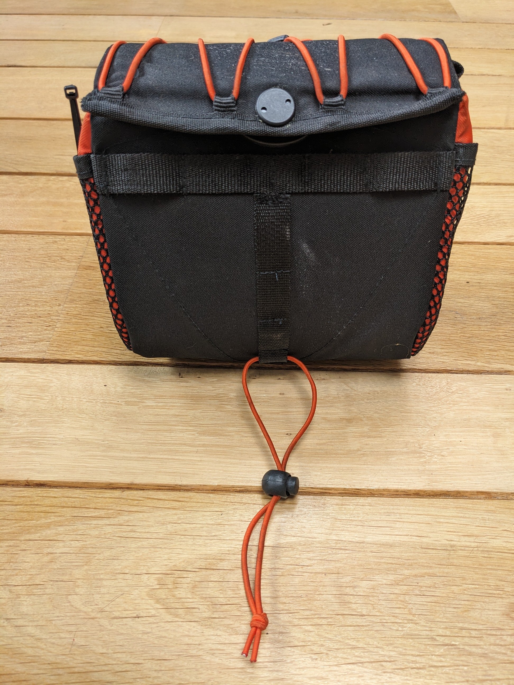 Aan te snoeren elastiek aan bovenzijde (bijv. voor regenjas) + mesh opbergvakken aan de zijkanten.