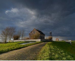Rechts lijkt me inderdaad een dijkwoning. En onder die vlag; staat daar een (waard) tent? Dat zou dan een minicamping nabij een rivier kunnen zijn.