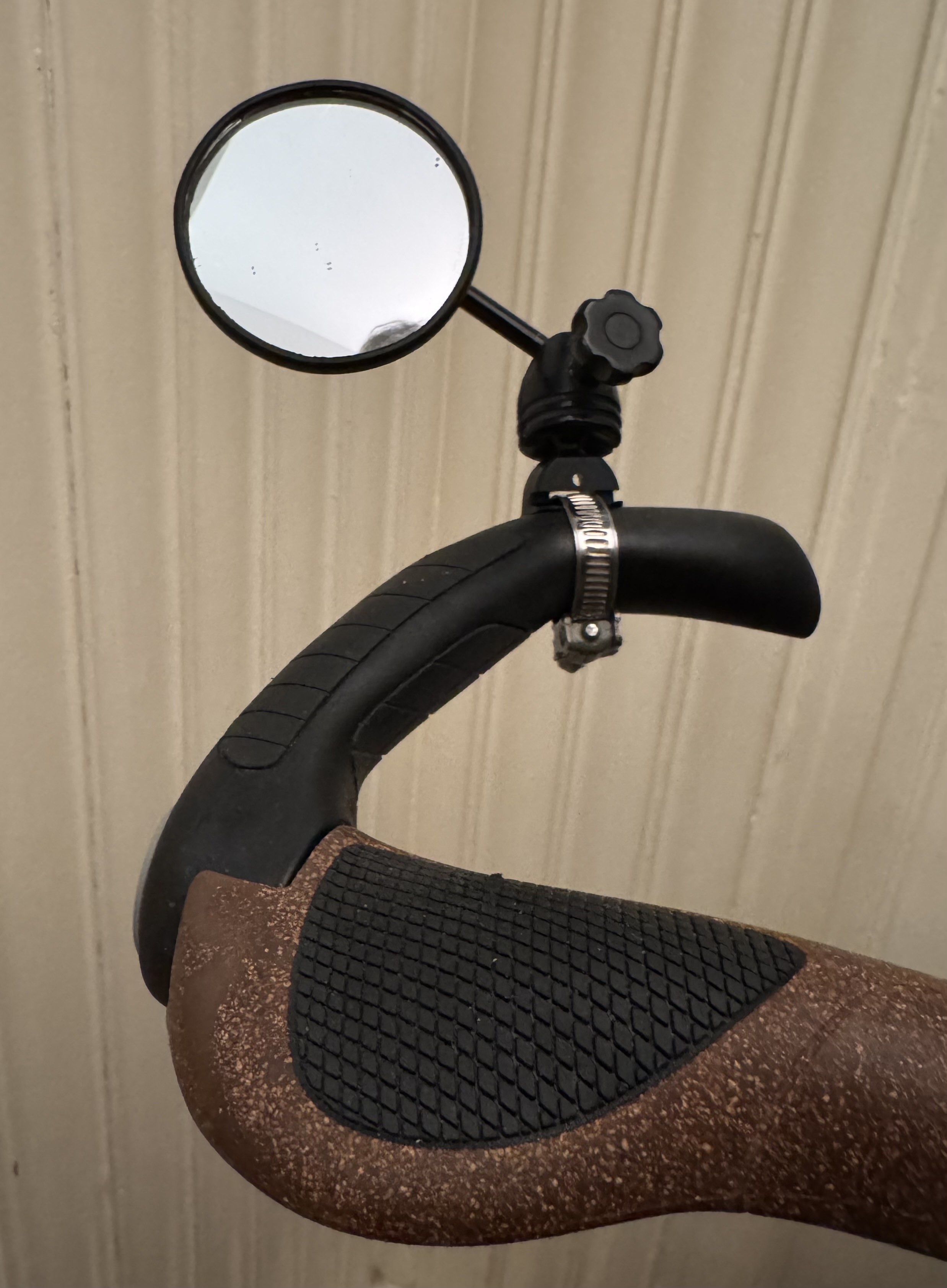 Maar het lijkt me ook een kwetsbaar onderdeel. Afgelopen zondag zat ik even op een bankje te pauzeren en een plotselinge windvlaag kieperde bijna mijn (beladen) fiets omver. Ik had amper handen vrij (boterham in de ene, telefoon in de andere) om in te grijpen maar toch kon ik voorkomen dat de fiets gevloerd werd. Dat had zeker mijn spiegel gekost. Dus misschien ook wel handig dat ik geen spiegel heb