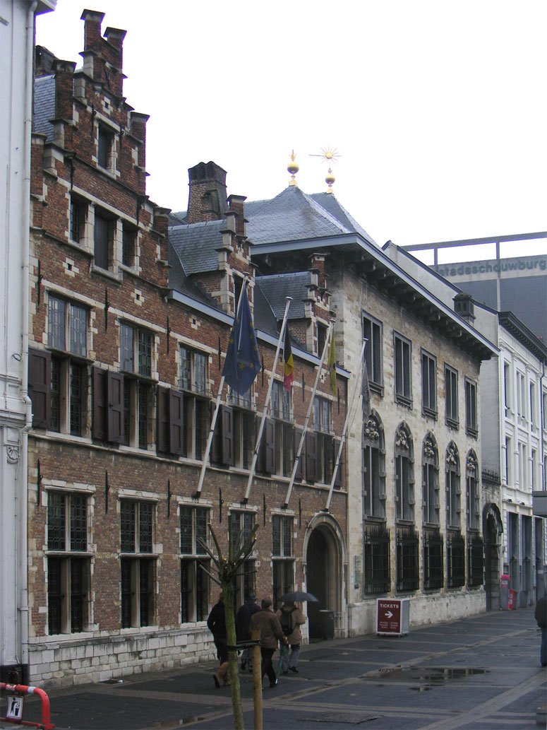 Ik zie daar linksboven iets van Hanzestedeschouwburg staan dus het is Nederlands taalgebied, geen Nederland (hooguit Maastricht) dus ergens in Vlaanderen (een grote(re) stad). Trouwens: er hangt een Belgische vlag aan de gevel, dus land is duidelijk. Ik kan overigens alleen maar "stedeschouwburg" lezen (of Stadsschouwburg) maar zoiets als Hanzestedeschouwburg lijkt me dan aannemelijk. Ik lees op Internet dat we hanzesteden kunnen vinden Antwerpen, Brugge, Damme en Dinant.