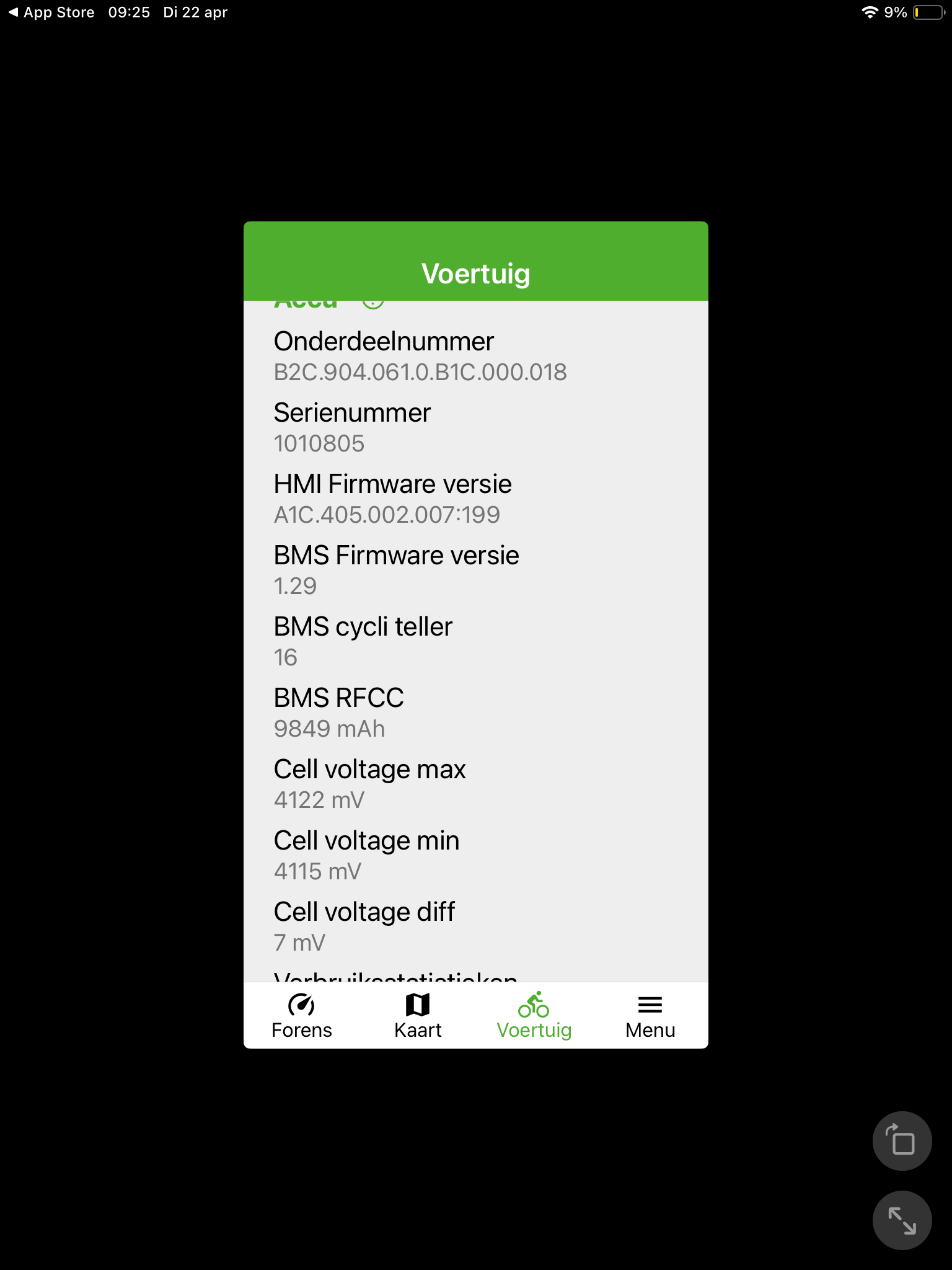 De accu vandaag geladen. De verbruiksmeter gaf 55Watt aan. Na 8,5 uur zakte dit af naar 34 W en na 9 uur was de accu vol. De verbruiksmeter gaf 0,5 kWh aan, maar dit is te onnauwkeurig, kan ook 0,599 zijn en dan geeft ie nog 0,5 aan. Als we dit optellen komen we op 484Wh uit, zonder warmteverlies. Heel interessant is de batterij gegevens in de app tijdens het laden. Daar staat bij BMS RFCC een waarde in mAh bij, die is nu 9640. Voor het laden was die waarde op 10.024 mAh. In de app info staat dat de BMS RFCC de capaciteit is. Als we de nieuwe waarde vermenigvuldigen met 48V komen we op 462,7 Wh. De BMS cycle count geeft het aantal volledige opladingen weer, bij ons 19 keer. Wellicht geeft de BMS RFCC een eenvoudig bruikbaar richtgetal in restcapaciteit aan, een beetje zoals Apple dat doet met de batterij?