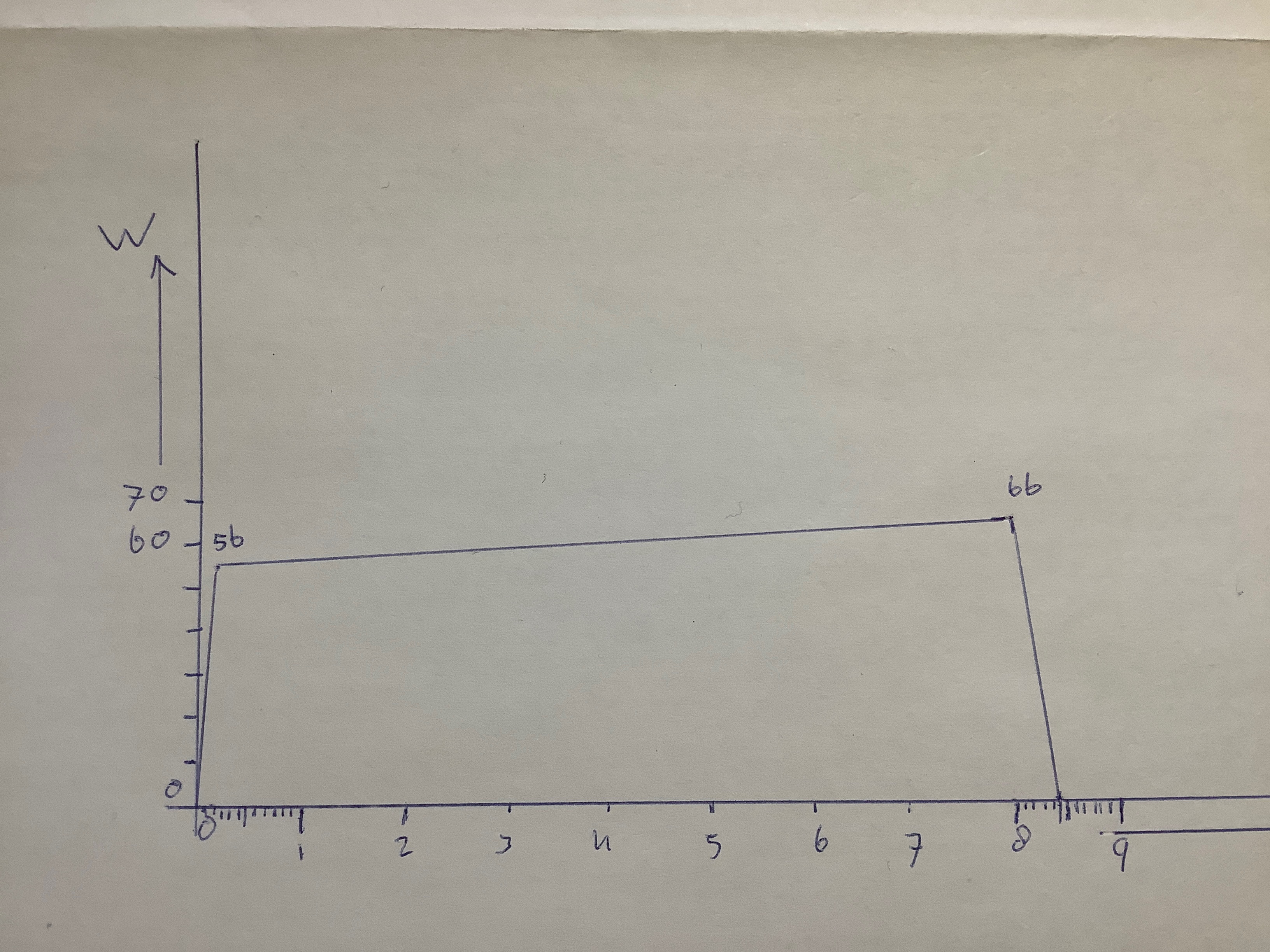 Hieronder staat de grafiek van het laden van mijn accu, die nog maar 3% over had, met de vermogens die de SilverCrest meter aangaf. Ik heb 10 meetpunten over een laadtijd van 300 min = 5 h.