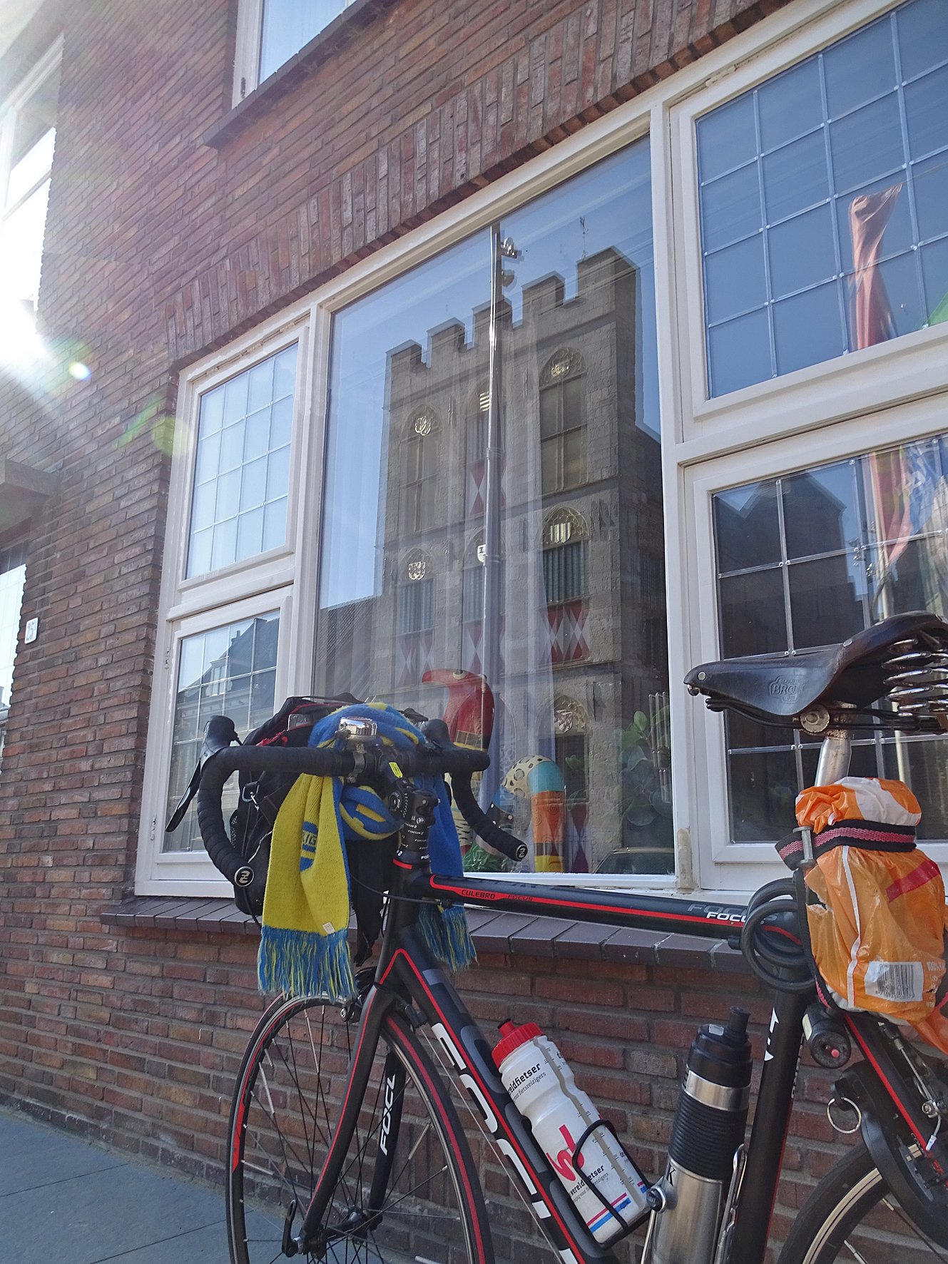 Kan je wel kleuren goed zien? Het is niet de gele Giant, maar een zwarte Focus racefiets. Ik heb namelijk drie fietsen en de gele Giant stond defect thuis. Niet tegen de winkelruit, de fiets staat op eigen steun. Het is eigenlijk een woonkamer-raam.