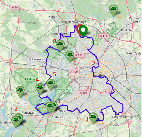 De Citycamping in Spandau ligt op zo'n 7 km van de MRW. Van daaruit heb je grofweg een noordelijke helft en een zuidelijke van de MRW, met langs de andere kant de Alexanderplatz, vanwaar er een rechtstreekse verbinding is naar Spandau (S-bahn, ook gewone trein vermoed ik). Als je de 2 helften in tegengestelde richting rijdt keer je 's avonds gewoon terug met de S-bahn. Als je het rondje in 1 richting wil doen moet je op en neer met de trein op dag 2. Als je het in meer dan 2 dagen doet neem je telkens nog een stukje U-bahn van het afstappunt naar de Alex. Of je eindigt in Potsdam op dag twee en fietst een rondje Potsdam Spandau op dag drie (als je clockwise rijdt). De Citycamping in Spandau loopt snel vol in lange weekends, reserveren kan geen kwaad.