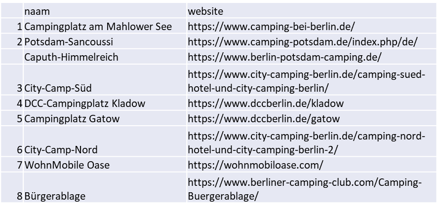 Wat wellicht een mooie oplossing is, is de camperplaats/camping vlakbij Gesundbrunnen (nr. 7 WohnMobile Oase). Vlakbij de route van de Mauerradweg en op Gesundbrunnen stoppen vele lijnen van de S-bahn en de U-bahn. En redelijk in het centrum (noordkant van Mitte)