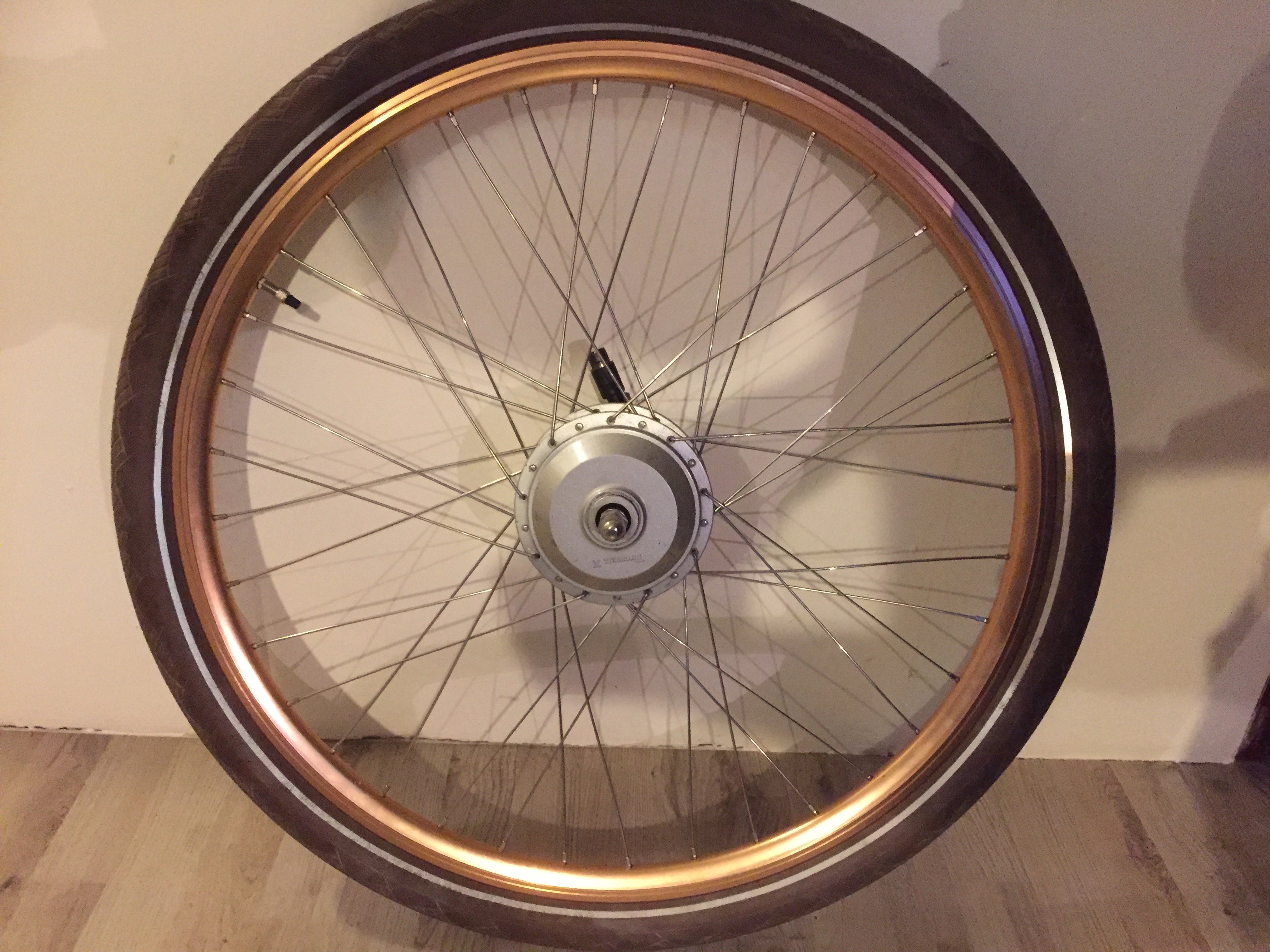 Mijn fiets heeft allemaal koper kleurige accenten. O.a. de velgen zijn koper kleurig. Dit is de reden waarom ik de velgen heb hergebruikt. En remblokjes op de velg, zou de koper kleur er in no-time af halen.