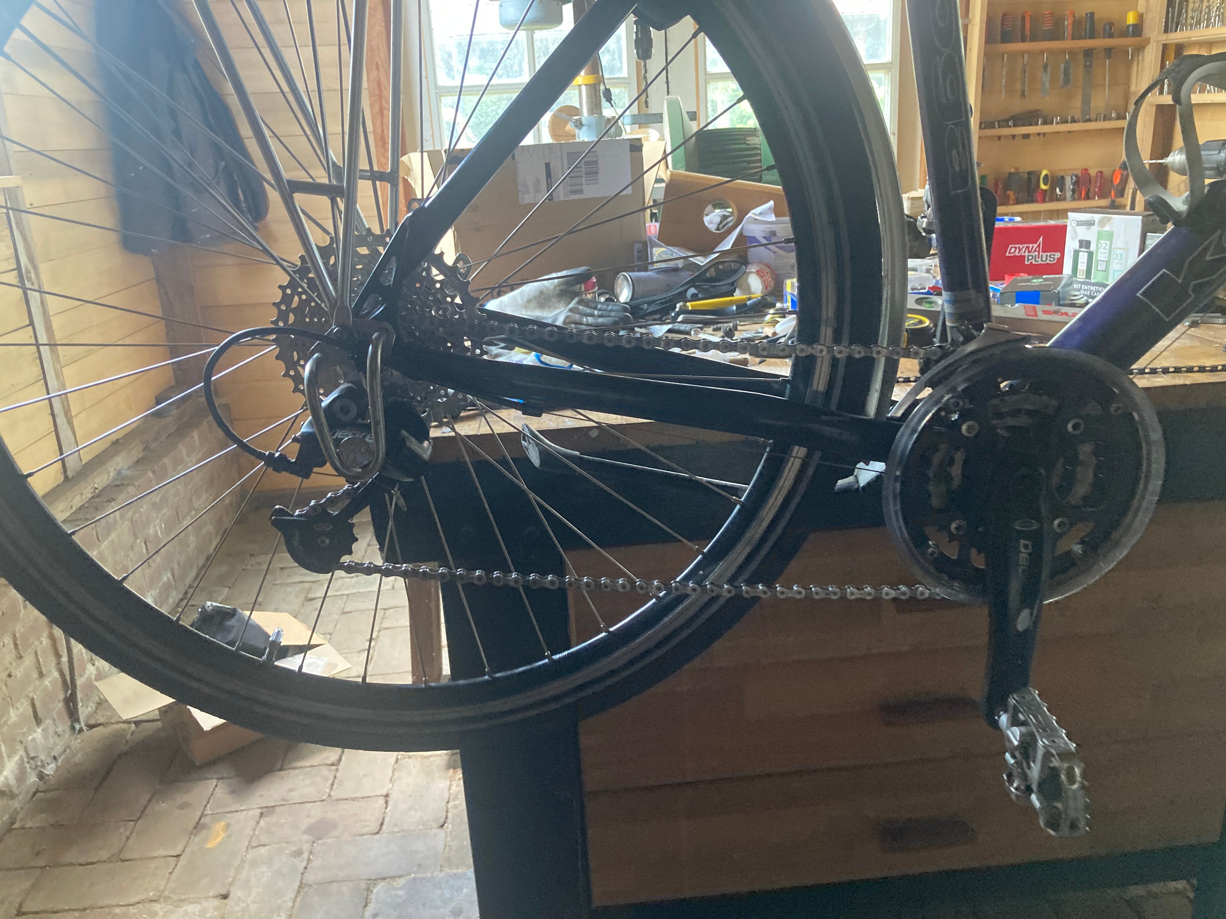 Ik zou ook even de combinatie grootste kettingblad vóór / grootste tandwiel achter proberen.