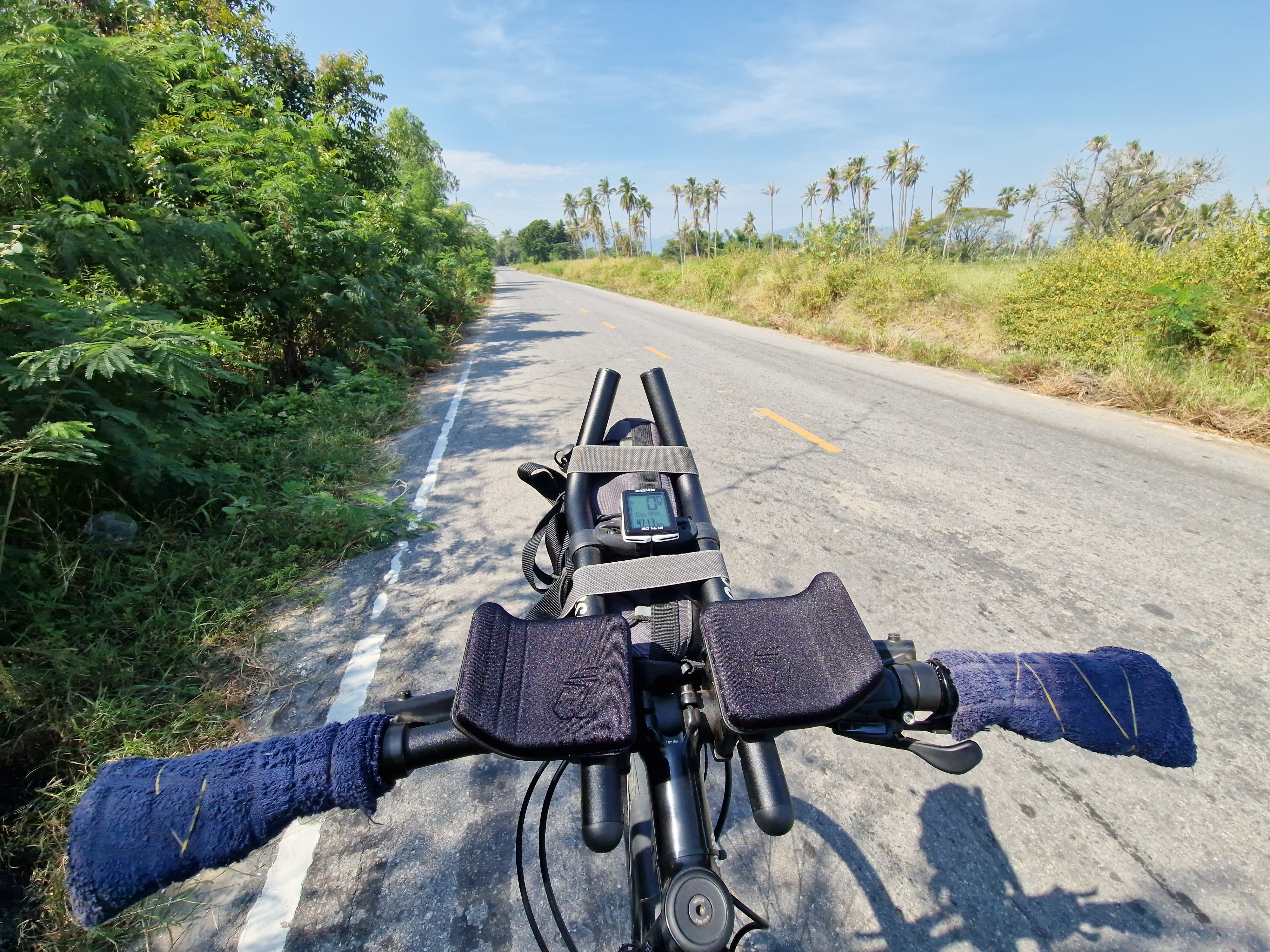 Mijn persoonlijke voorkeur: comfortabele zachte minihanddoekjes rond de handvatten bevestigen met elastiekjes. Zacht, dempend, luxegevoel, absorbeert al het zweet, makkelijk wasbaar, handen kunnen vrij blijven zweten (en dus afkoelen) bij heet weer. Maar ik heb de indruk dat ik ongeveer de enige (idioot?) ben die dit doet. 😅