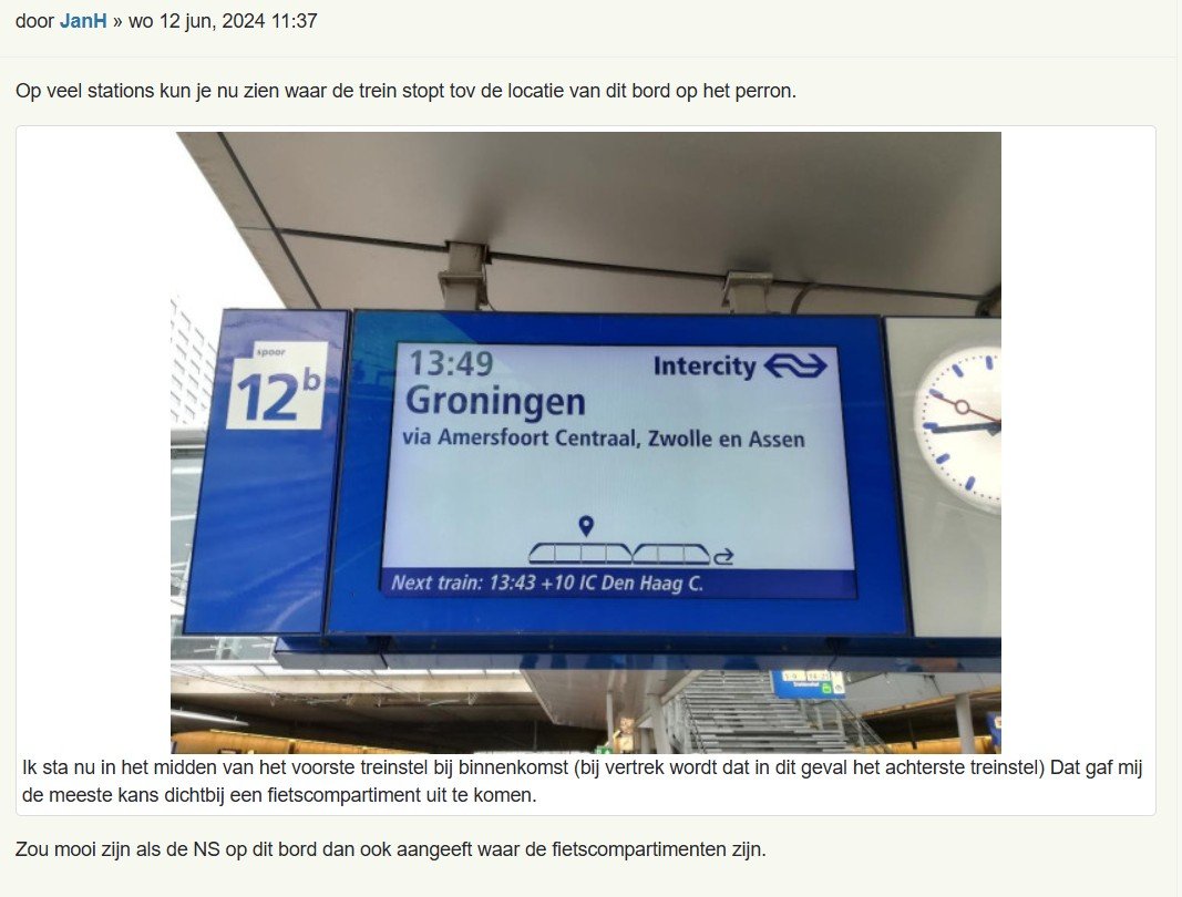 Bij de ICMm (aka Koploper) is het lastig, je weet nooit of de fietsplekken voor- of achteraan zijn. Dan is het goed kijken naar de locatie van de stroomafnemers.