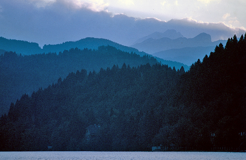 Ik heb (excuus voor de eigenaar) de foto op photoshop wat minder donker gemaakt. Dacht ik dat onderaan een betonnen rand lag, maar het blijkt een meer te zijn. En er wordt een huis met een wolfsdak zichtbaar, dan zou ik ergens in de Duitstalige gebieden moeten zoeken....