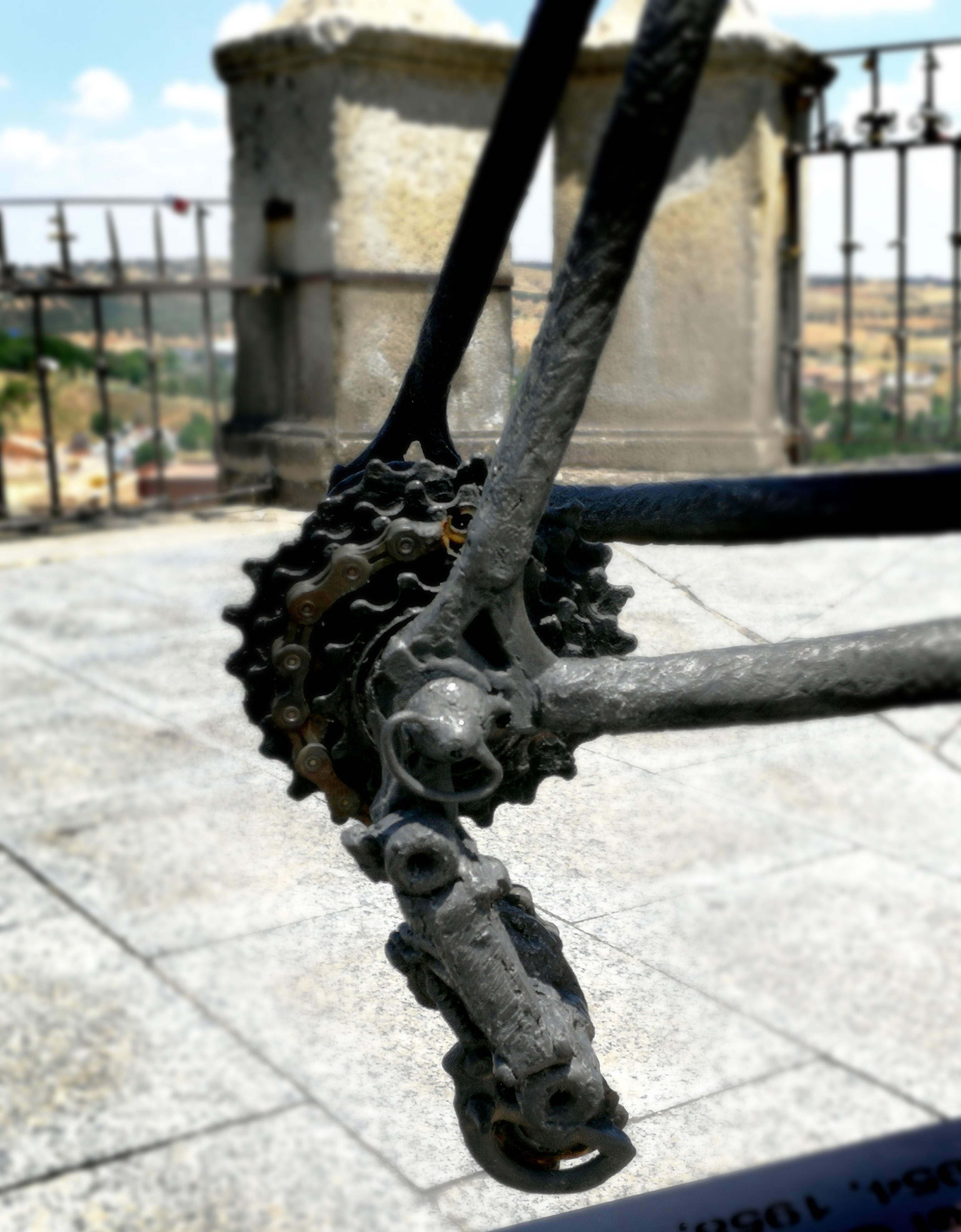 Dat wordt gokken. Het is in Spanje. In een oude stad die op een heuvel gelegen is. Met een standbeeld van een verbrande fiets, una estatua de una bicicleta quemada, volgens deepl.