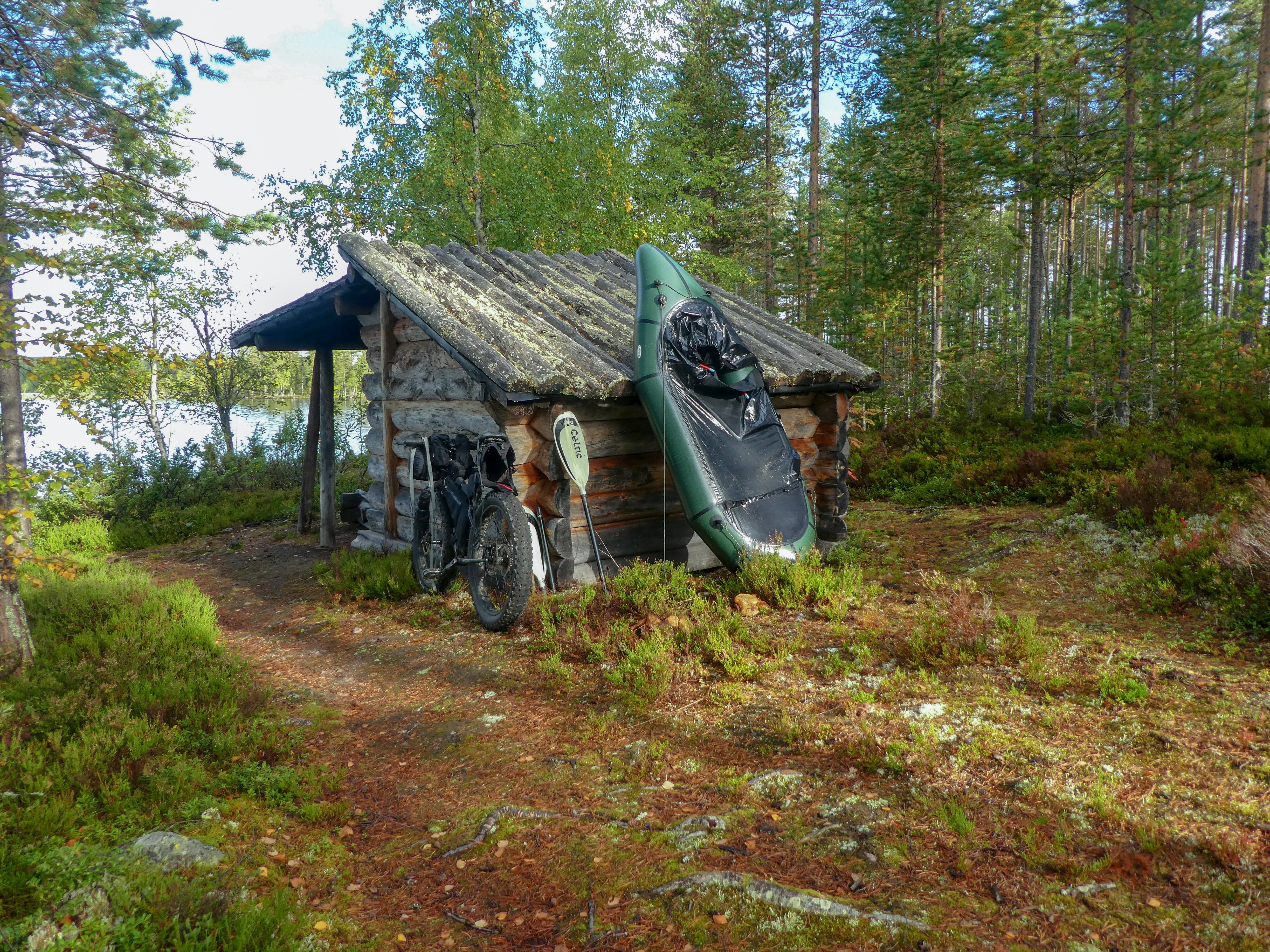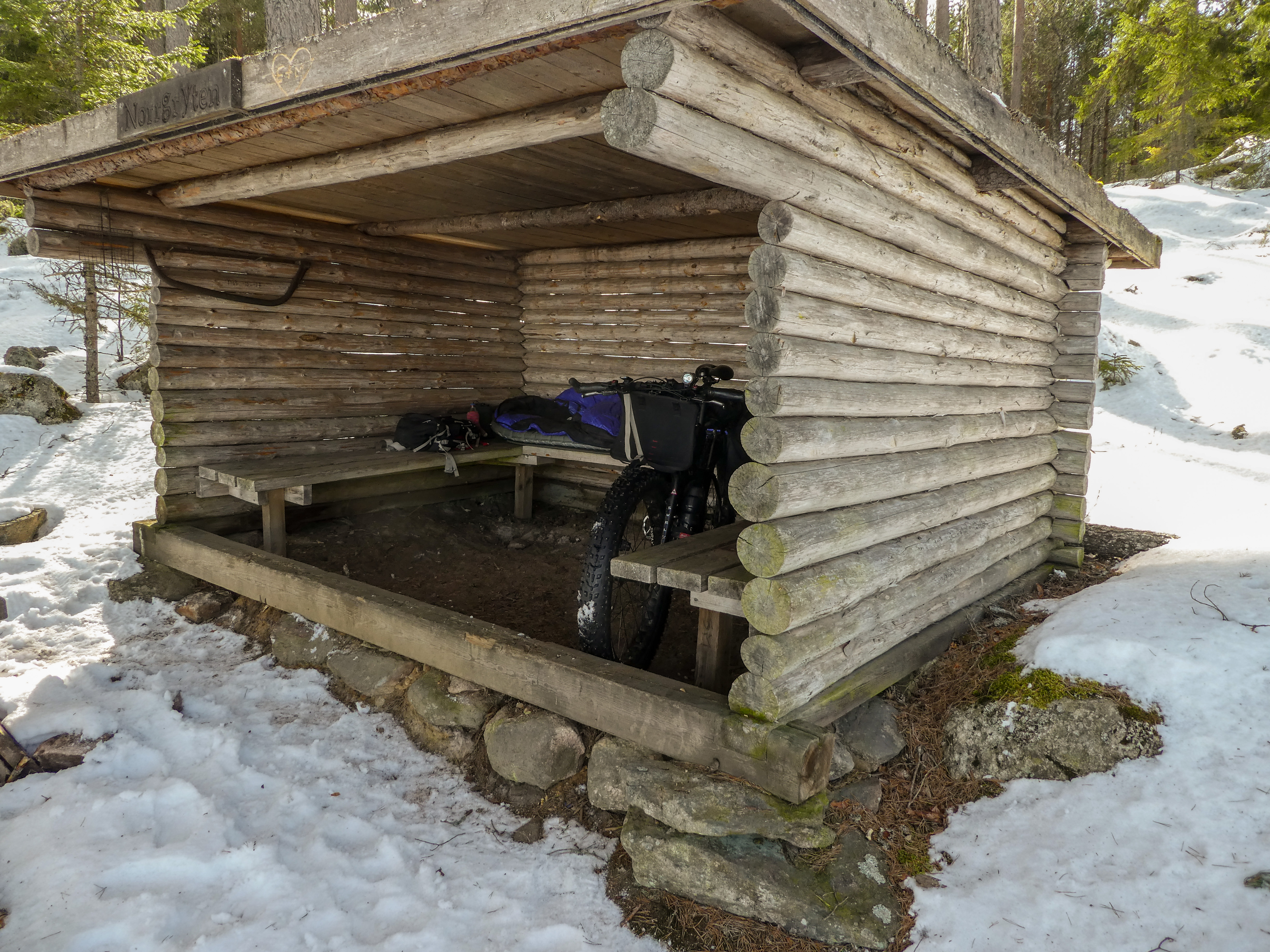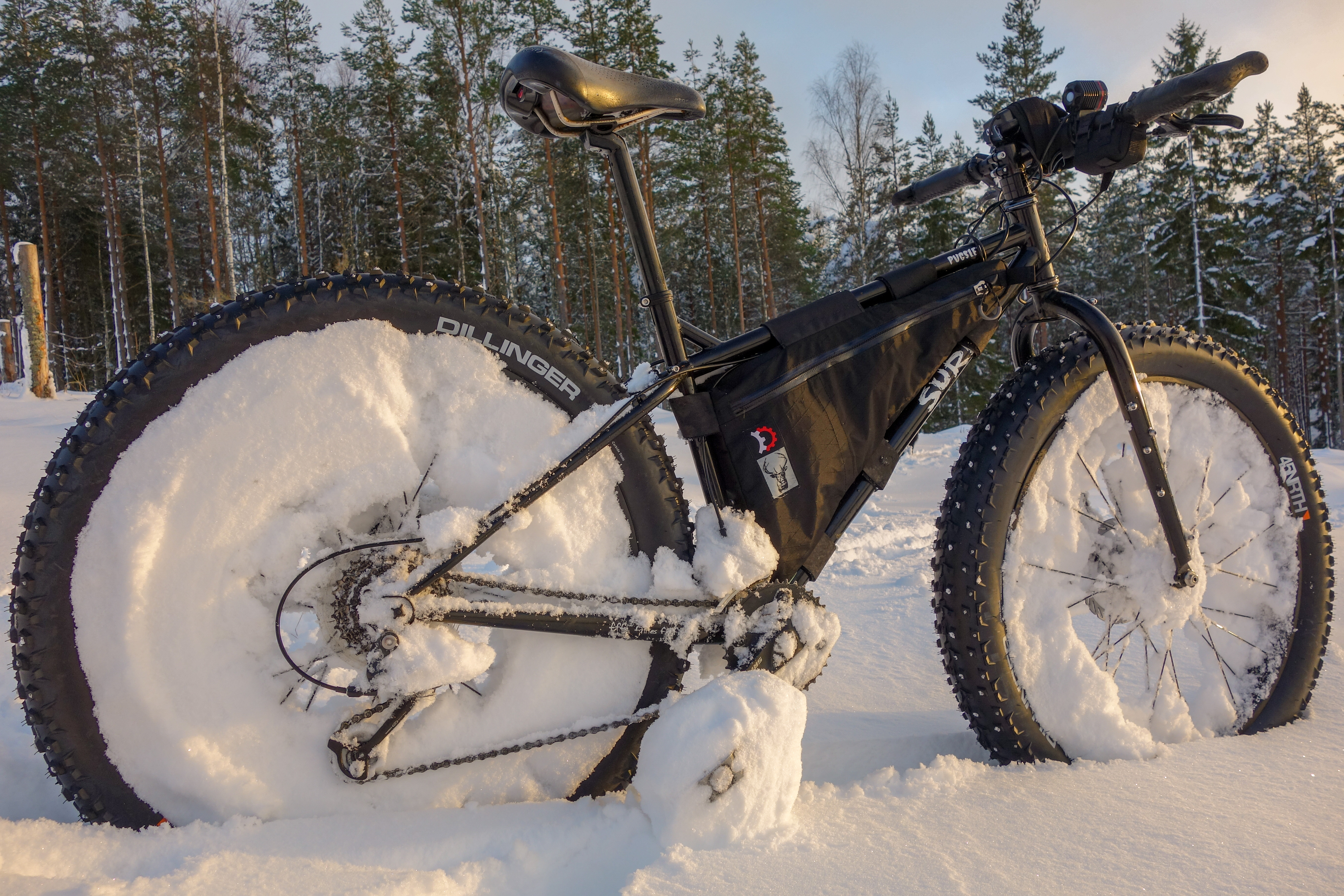 De fatbike slaapt meestal languit in de sneeuw naast de tipi. Een lange stok zoeken om hem te ondersteunen is een heel gedoe in diepe sneeuw, je wordt alleen maar koud en de sneeuw dringt in je laarzen, handschoenen, mouwen etc. Vaak zitten stokken ook vastgevroren in een dikke ijssneeuwlaag en tis zowiezo nog de vraag of het zou helpen want bij nieuwe sneeuwval verdwijnt de fiets toch.