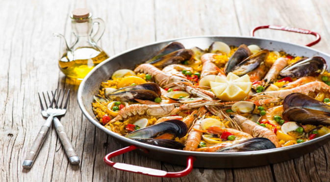 Paella, rijstgerecht. De garnalen doen er niet toe. De "oorspronkelijke" paella bevatte konijn en bonen.