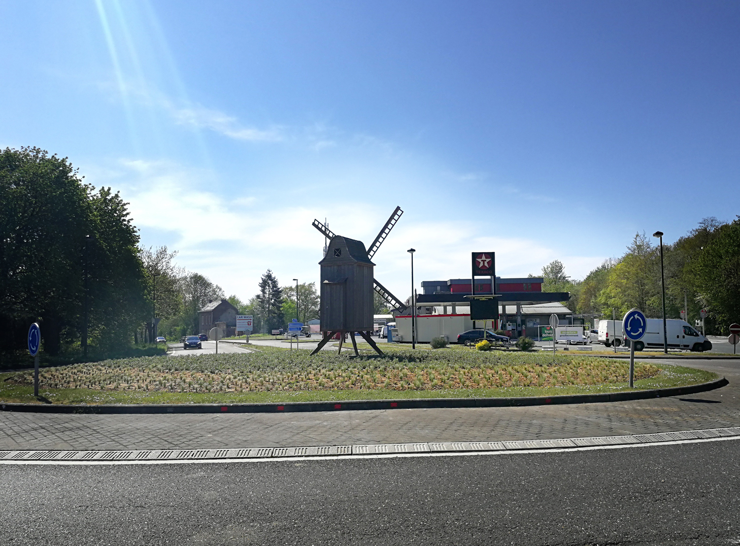 Het bovenste bord van de wegwijzer lijkt een lange plaatsnaam te hebben. Het witte bord rechts met Adventure prochainement, daar is op Google niks over te vinden. Achter de molen staat een zendmast voor mobiel telefoonverkeer.