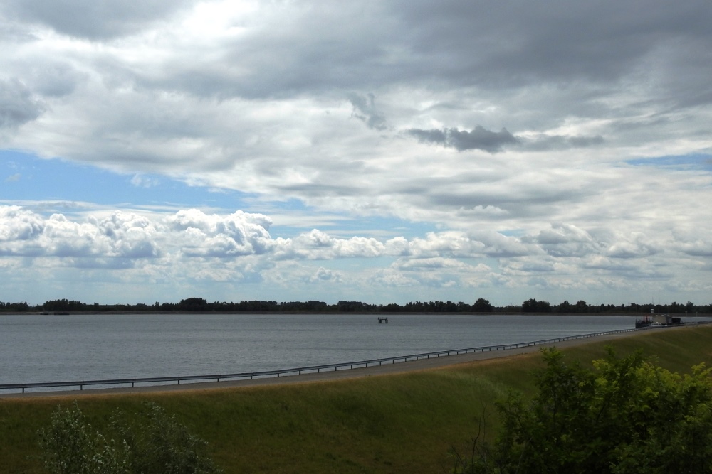 Een gemeen moeilijke foto. Zie ik midden achter een soort van pijpleiding lopen? Daarboven twee mobiele zendmasten. Links ontwaar ik in de verte een industrieel gebouw. De KPN-toren aan de Peizerweg in Groningen? Of dit hoogholtje (Gronings voor hoge houten bruggetje) zich in het sterk verrommelde landschap om of nabij Hoogkerk bevindt? Moet ik nog zoeken op Google satelliet.