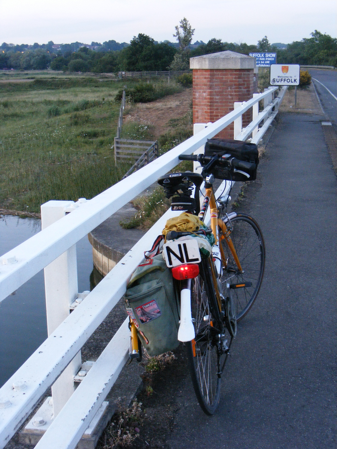 Het feit dat zowel mijn fiets als de twee borden links stonden zou men al meteen aan Engeland denken. Na aankomst van de boot om 20.00 uur in Harwich trein genomen naar Manningtree en dan was het nog maar 6 km fietsen naar de jeugdherberg van Brantham (nu helaas opgeheven). Helemaal fietsen was geen optie, want de deur van de jeugdherberg ging om 22.00 uur dicht. De foto is in mei 2011 genomen.