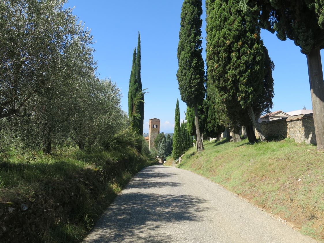 Punt 1: Onmiskenbaar Italië, dus de fietsroute naar Rome. Dan een goede kans op omgeving Florence. De weg was aflopend dus moest wel naar een rivier lopen. De rivier Arno dus zeer waarschijnlijk. En dan met de satelliet een weggetje vinden, leidend naar een kerktoren, gezien de stand van de zon richting ONO, geflankt door cipressen en olijfboompjes, met een ommuurde begraafplaats ernaast, was vervolgens niet zo moeilijk meer.