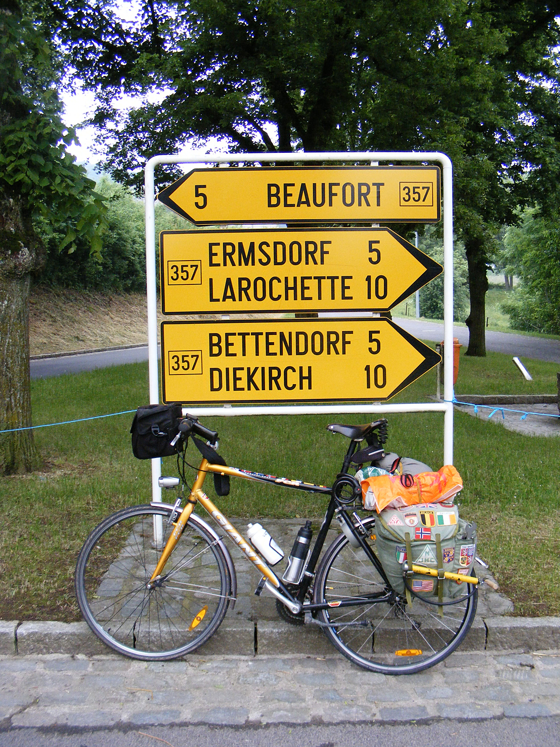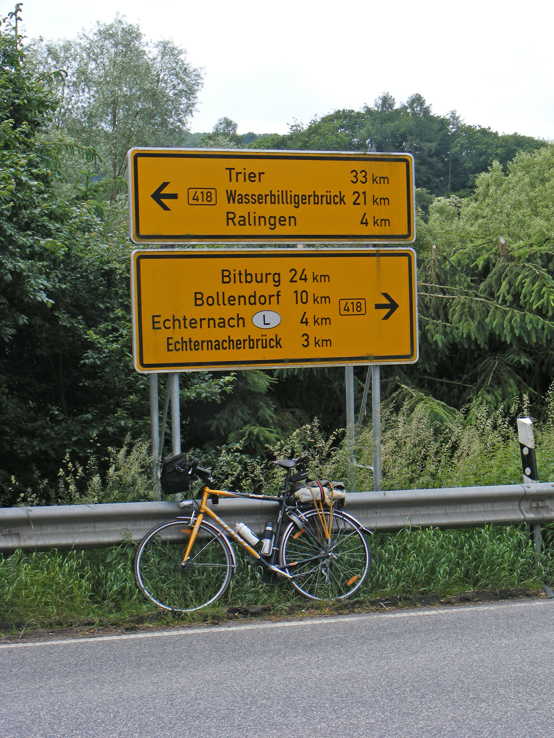 Dan moet die vlag van Luxemburg zijn, maar de gehele grens tussen Luxemburg en Duitsland bestaat uit een rivier, van Schengen tegen Frankrijk aan tot Ouren bij België. Luxemburg heeft ook gele wegwijzers, maar die hebben altijd een pijlpunt (zie voorbeelden onder). En ik zie hier geen water. Zou die driekleur zomaar erop geplakt zijn?