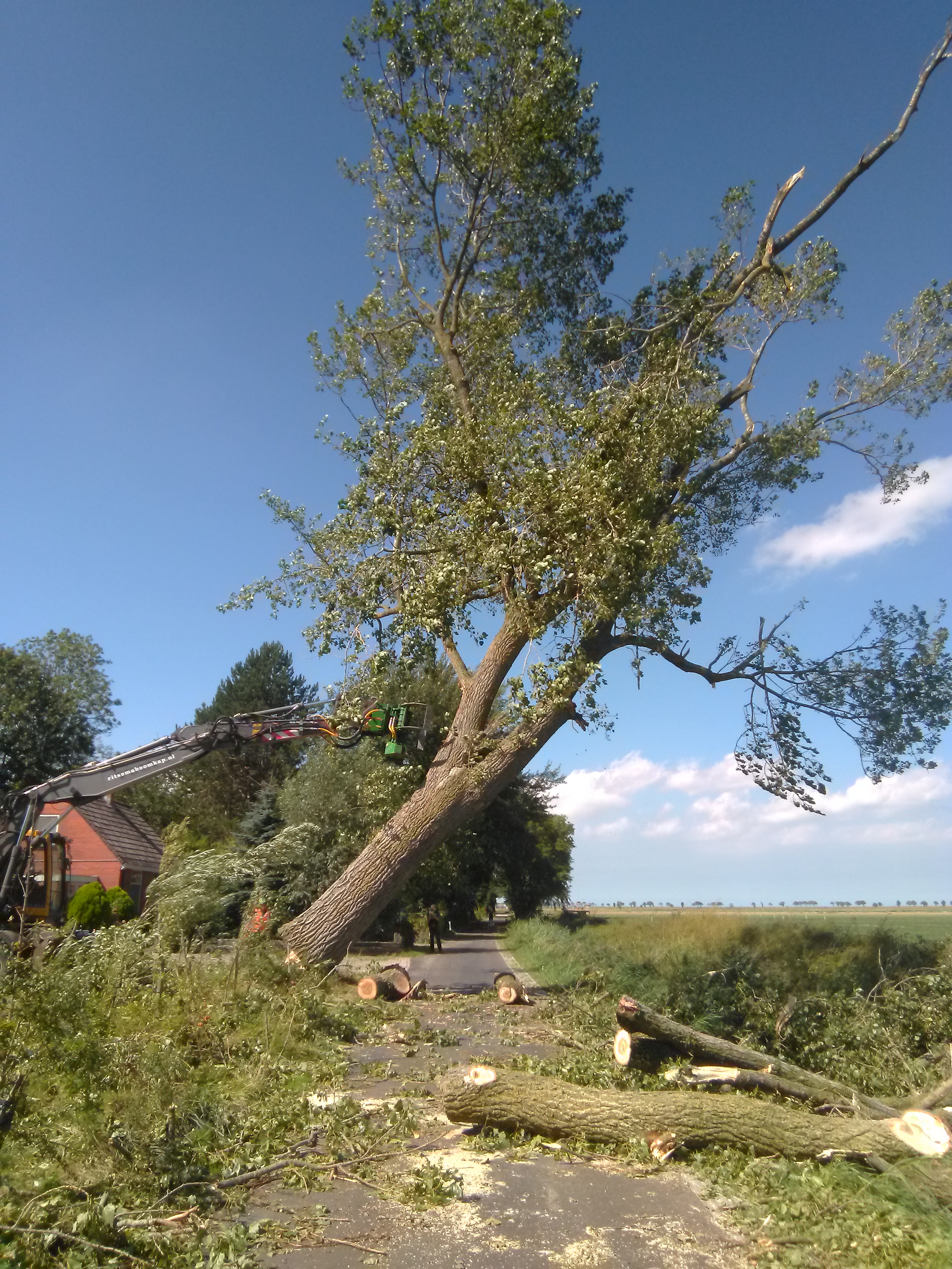 Nu effe geen zin meer, ben chagrijnig. Vannacht was er zwaar onweer met slagregens en wervelwinden. Zo erg, dat het water over de deurdrempels binnen kwam. Vanmorgen in de omgeving gaan kijken. Onze tuin is nu een ravage, en de erachter gelegen moestuin helemaal vernield, geen tomaat meer over. Overal afgerukte boomtakken. Druk doende de tuin van de rommel te verlossen. Gelukkig liggen de dakpannen nog op hun plaats. De reusachtige boom van twee huizen verderop, waar wij al 34 jaar tegenaan keken, heeft het niet overleefd en de gemeente heeft hem opgeruimd. De stam was aan de grond 1,40 meter dik.