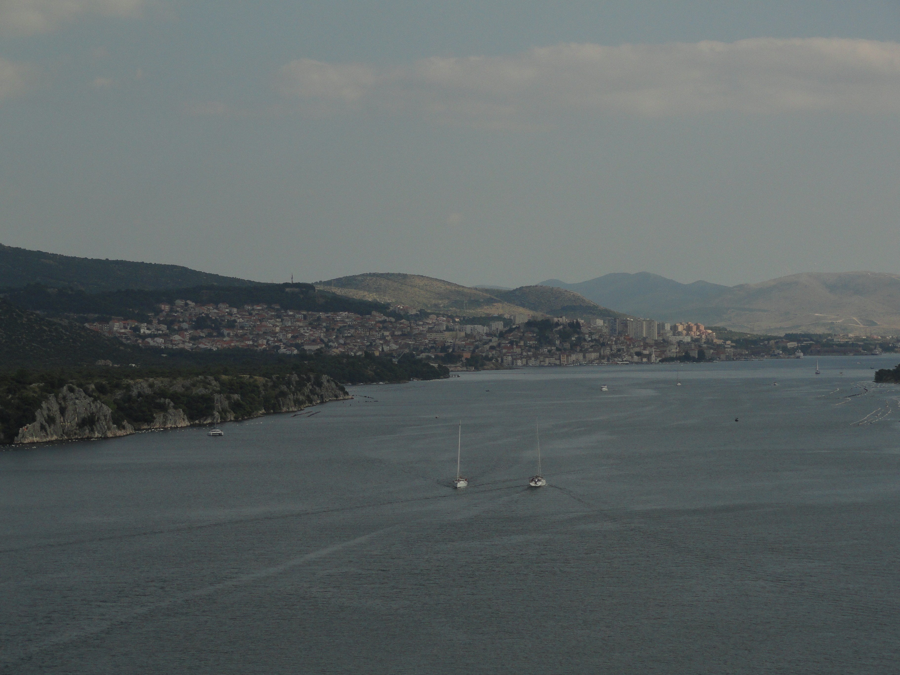 Je kijkt hier naar Šibenik Kroatië, het is me alleen niet duidelijk of je dat vanaf de brug of Hotel Panorama (toepasselijke naam) doet.