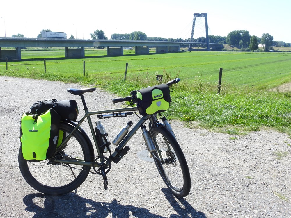 Was gisteren en vandaag ook (weer) loeiheet. Hier extra voorzieningen op de fiets: 3 keer 0,8 liter en een 1l thermosfles. En een flesje frisdrank van een benzinepomp in de feedbag
