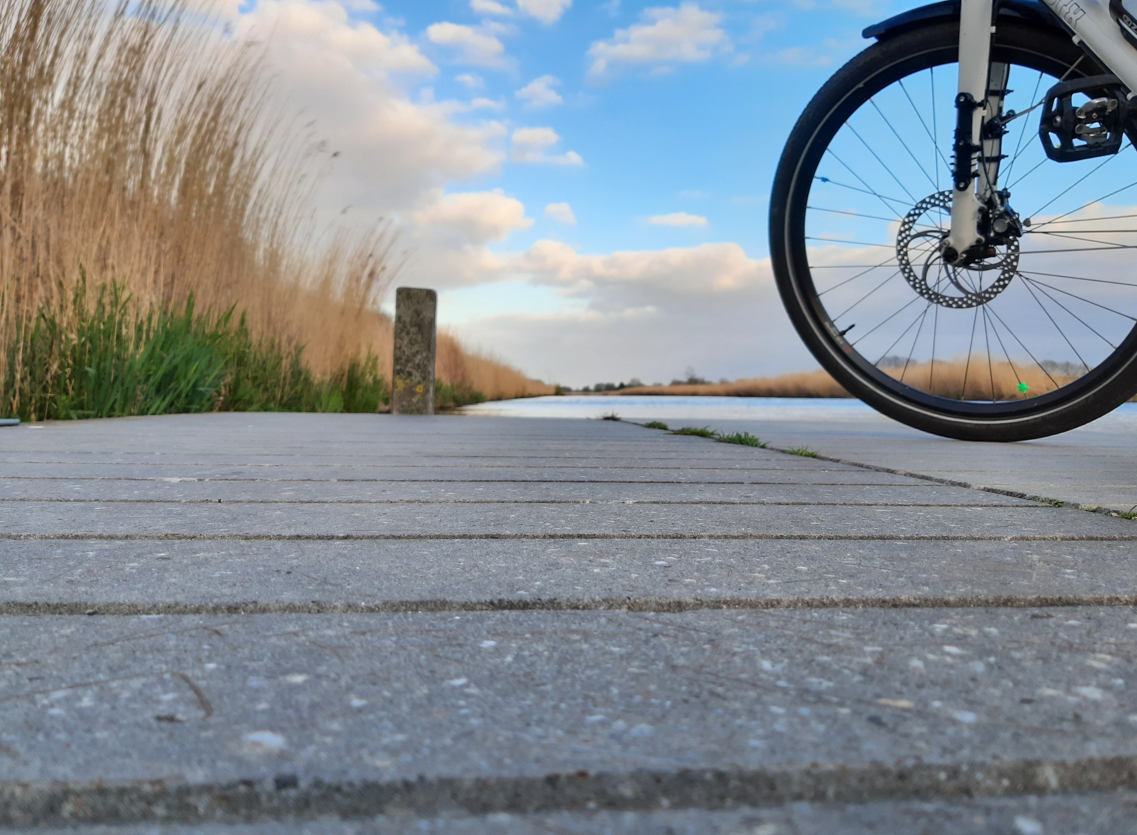 We gaan picknicken op een steiger met uitzicht op een fraaie platbodem in de rietkragen aan de overkant. Wanneer er even geen snelverkeer voorbijkomt, genieten we van vogelconcerten. In ieder geval hebben we nu geen last van de vliegtuigen, die we hier anders de hele tijd boven ons zouden horen.