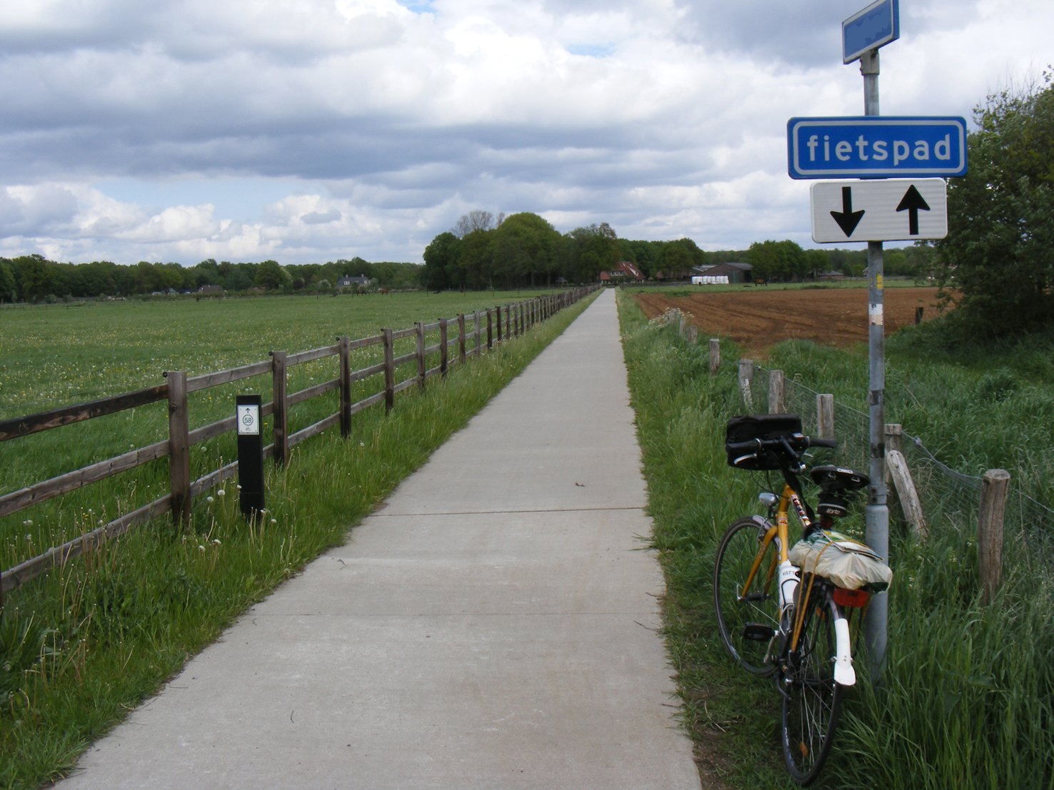 Blijkbaar toch erg moeilijk. Zoals jullie vast hebben opgemerkt is de foto van boven genomen. Ik fietste dan ook op een dijk. Zojuist was ik een plaats gepasseerd waar de dijk in een grote boog omheen ligt. Vroeger werd de plaats aan drie kanten omgrensd door de rivier, nu is de rivier strak getrokken.