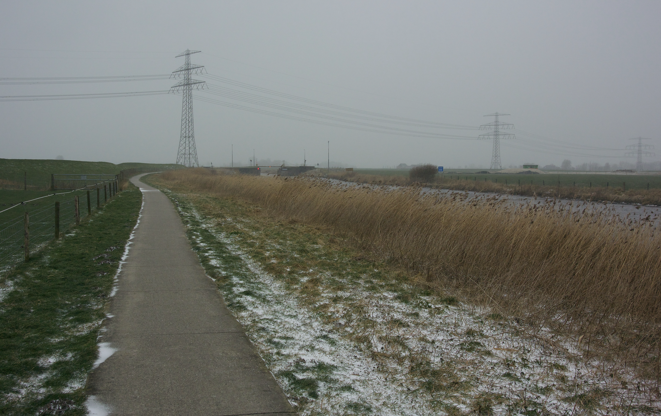 Ja, dat is’m. Brug over het Reitdiep bij Wetsinge, met rechts de bouwactiviteiten voor het nieuwe hoogspanningstracé.