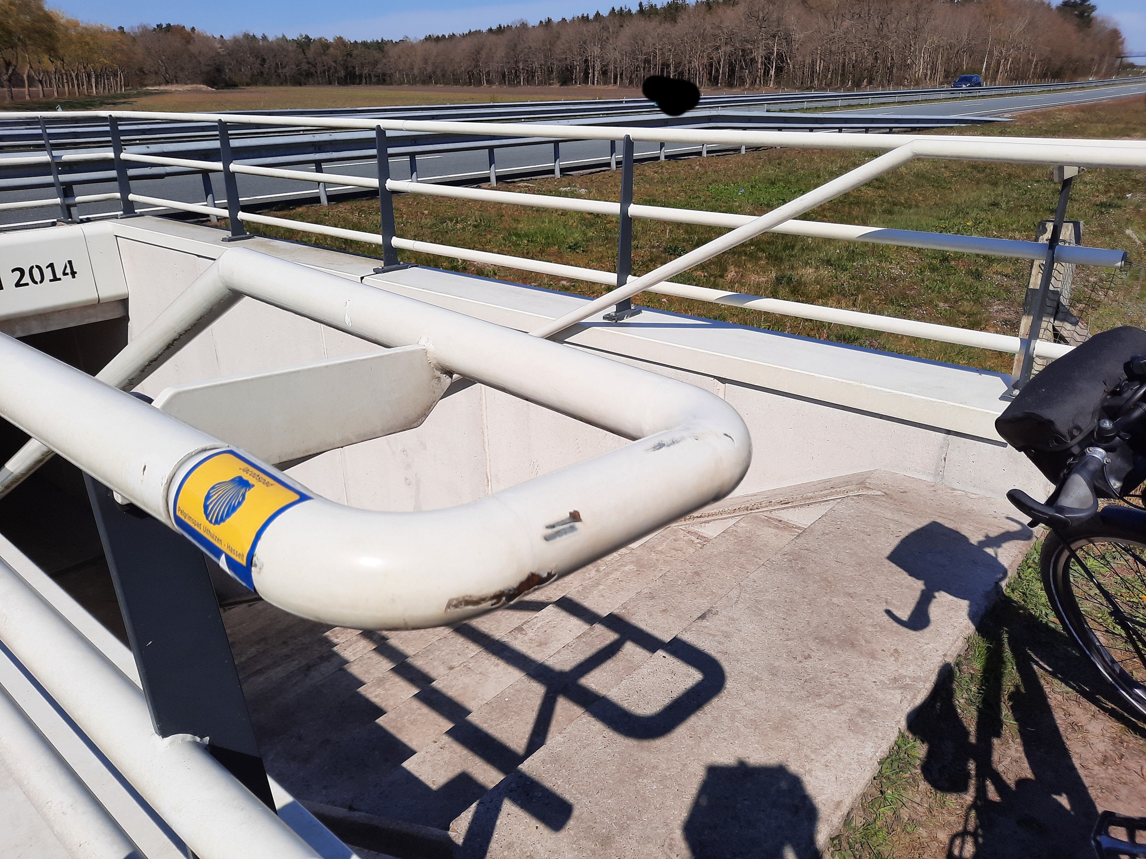 Nee. Maar met zoeken op Sint Jacobspad Uithuizen Hasselt kwam ik op een OSM met een fietsroute. (https://elcidroute.nl/ned/php/umap_fiets.php) Bij elke kruising met een snelweg vervolgens in de omgeving gekeken. Bij Rolde was het raak. Zie hieronder: