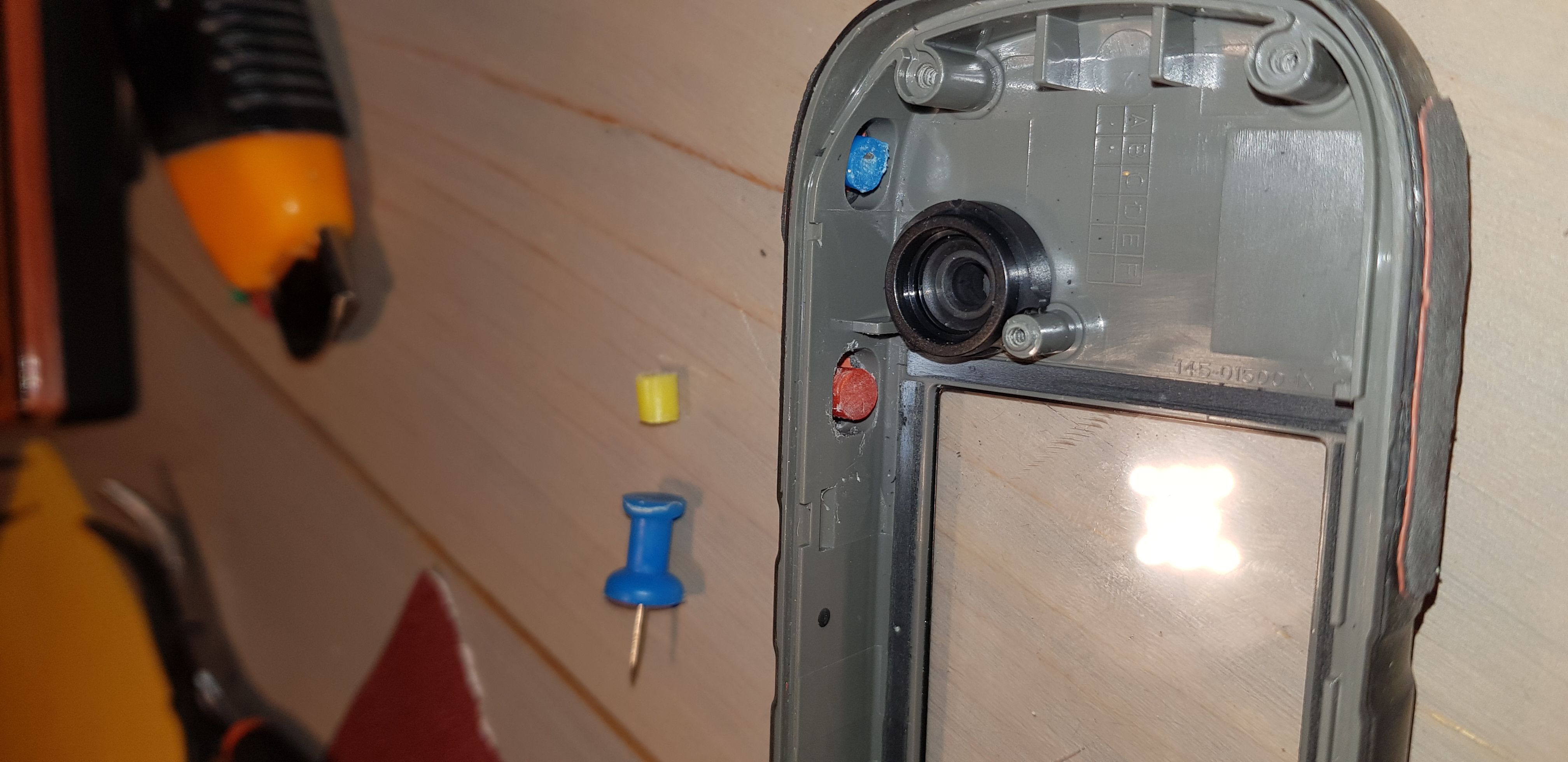 Mijn man heeft gelijk alle 5 de knoppen vervangen met een prikbordpunaise( die je in verschillende kleuren heb. Hier van het middelste stukje afgezaagd,.geschuurd aan pincet op schuurpapier, gelijmd via de binnenkant en via de buitenkant met bandenplakkers geplakt..