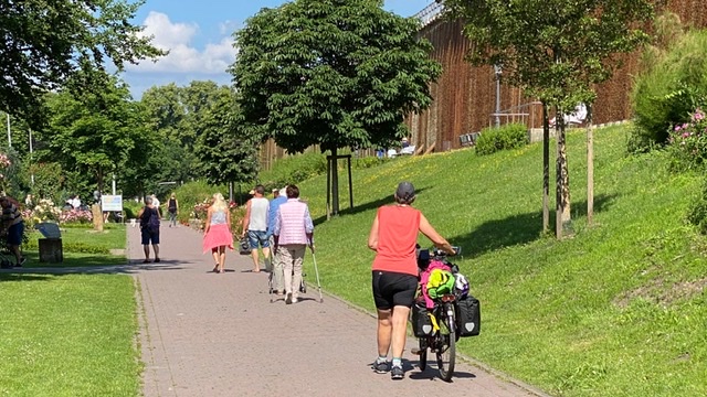 Vanaf de Hermannsweg fietsten we Bielefeld in, druk met wandelaars en mountainbikers.